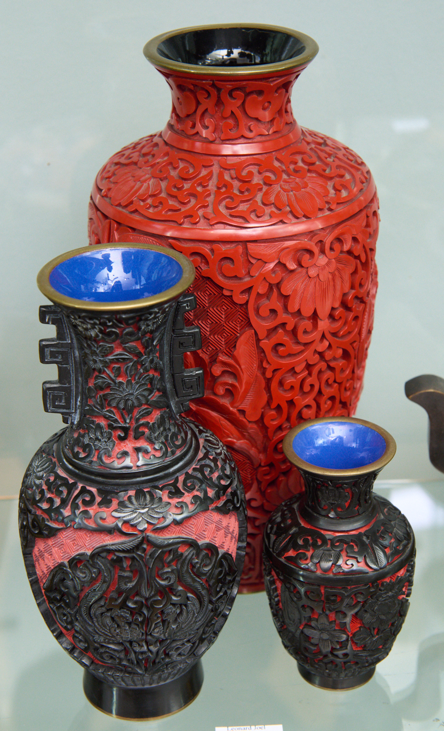 A GROUP OF THREE CHINESE CINNABAR STYLE VASES H.24CM, LEONARD JOEL LOCAL DELIVERY SIZE: SMALL