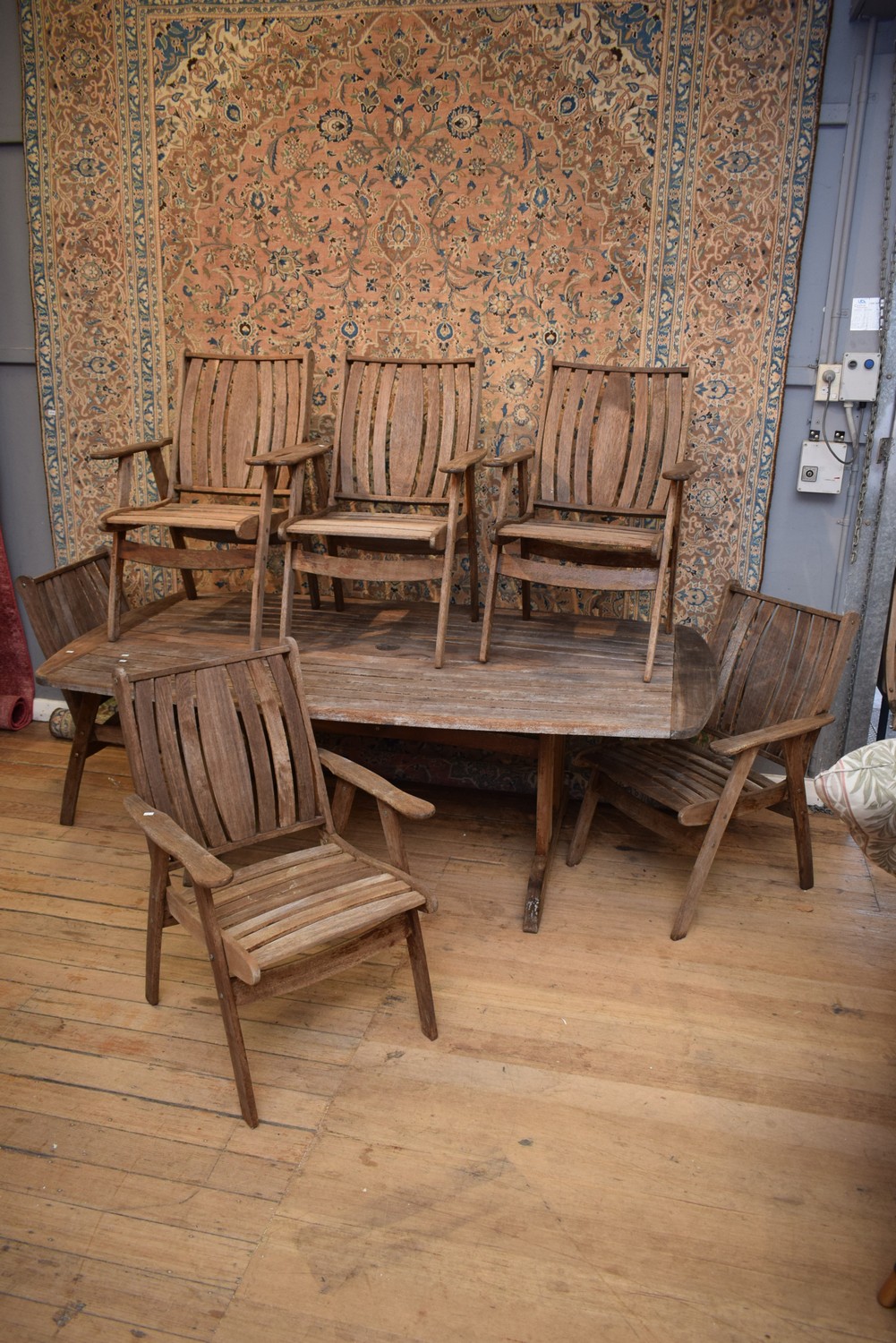 A SEVEN PIECE TEAK OUTDOOR SETTING (A/F) (TABLE 72H x 210W x 120D CM) (PLEASE NOTE THIS HEAVY ITEM MUST BE REMOVED BY CARRIERS AT THE CUSTOMER'S EXPENSE. LEONARD JOEL STAFF CANNOT ASSIST CARRYING THIS ITEM) (X-LARGE ITEM)