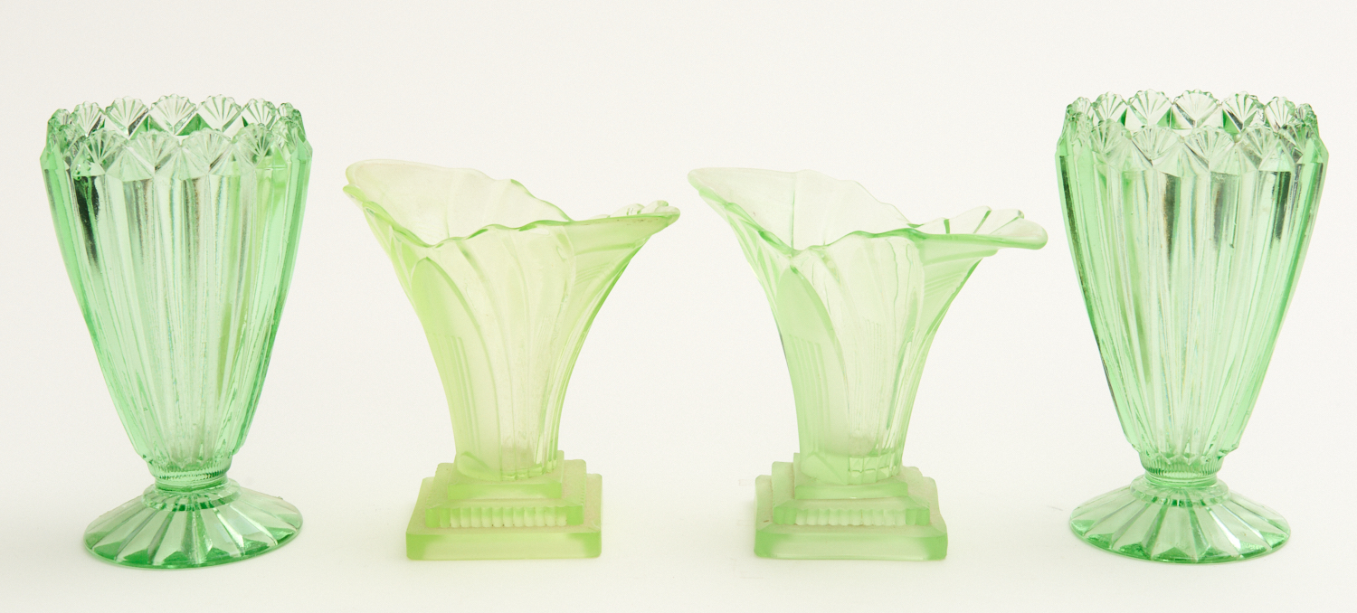 TWO PAIRS OF DECO DEPRESSION GLASS VASES, LEONARD JOEL LOCAL DELIVERY SIZE: SMALL
