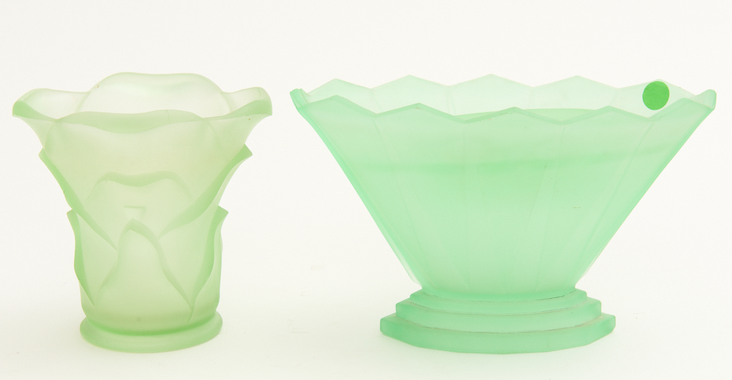 AN ART DECO FROSTED GREEN GLASS ROSE BOWL TOGETHER WITH VASE H.16CM, LEONARD JOEL LOCAL DELIVERY SIZE: SMALL
