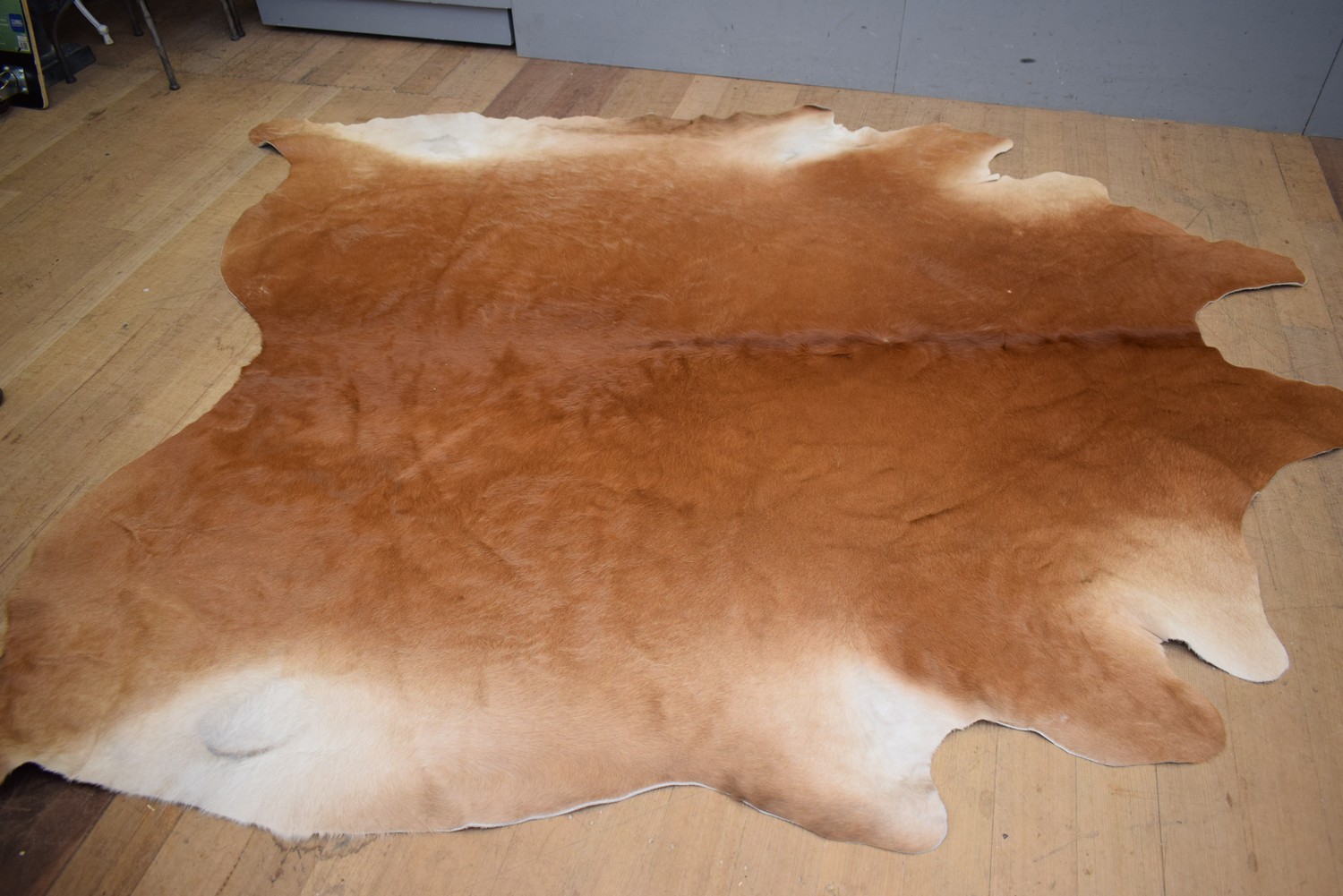 A LARGE TAN COWHIDE RUG ( 244 X 218 CM) (LEONARD JOEL DELIVERY SIZE: LARGE)
