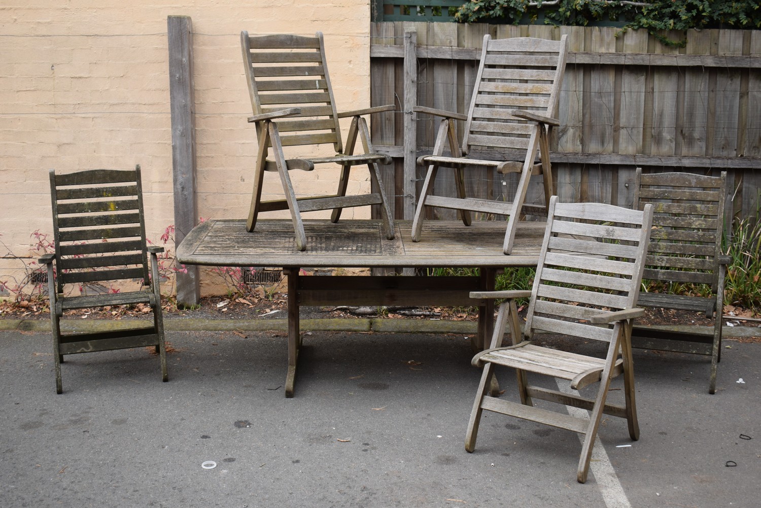 A TEAK OUTDOOR SUITE COMPRISING DINING TABLE AND FIVE CHAIRS. THE CHAIR BACKS HAVE AN ADJUSTABLE HEIGHT FEATURE. (H74 X W221 X D111 CM) (A/F) (PLEASE NOTE THIS HEAVY ITEM MUST BE REMOVED BY CARRIERS AT THE CUSTOMER'S EXPENSE. LEONARD JOEL STAFF CANNOT ASSIST CARRYING THIS ITEM) (X-LARGE ITEM)