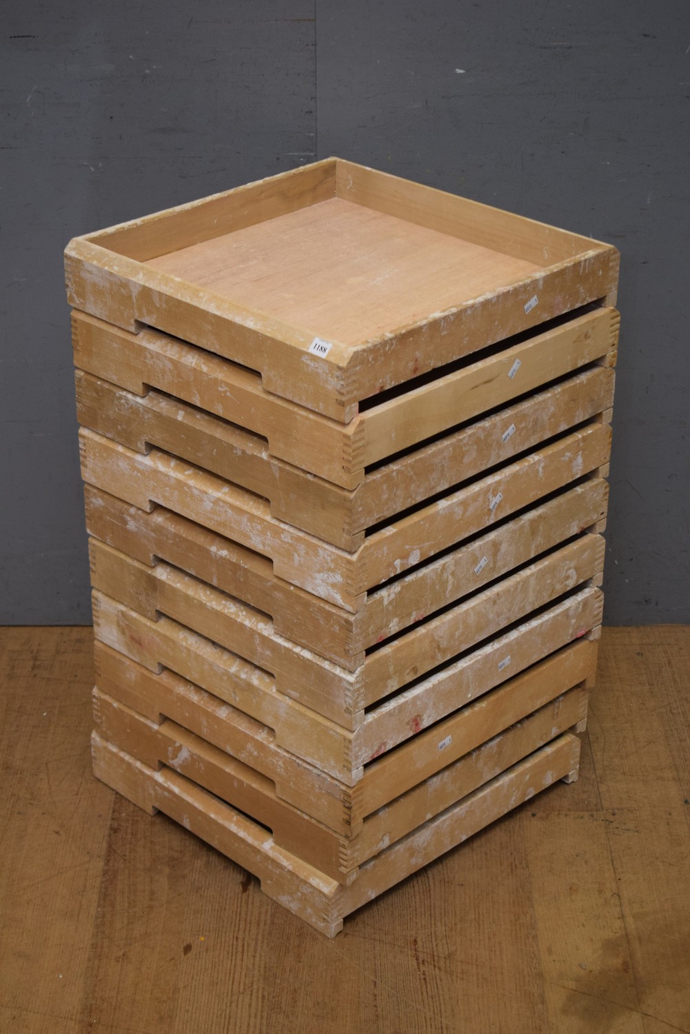 A SET OF TEN TIMBER DOUGH TRAYS (9H x 46W x 46D CM) (LEONARD JOEL DELIVERY SIZE: LARGE)