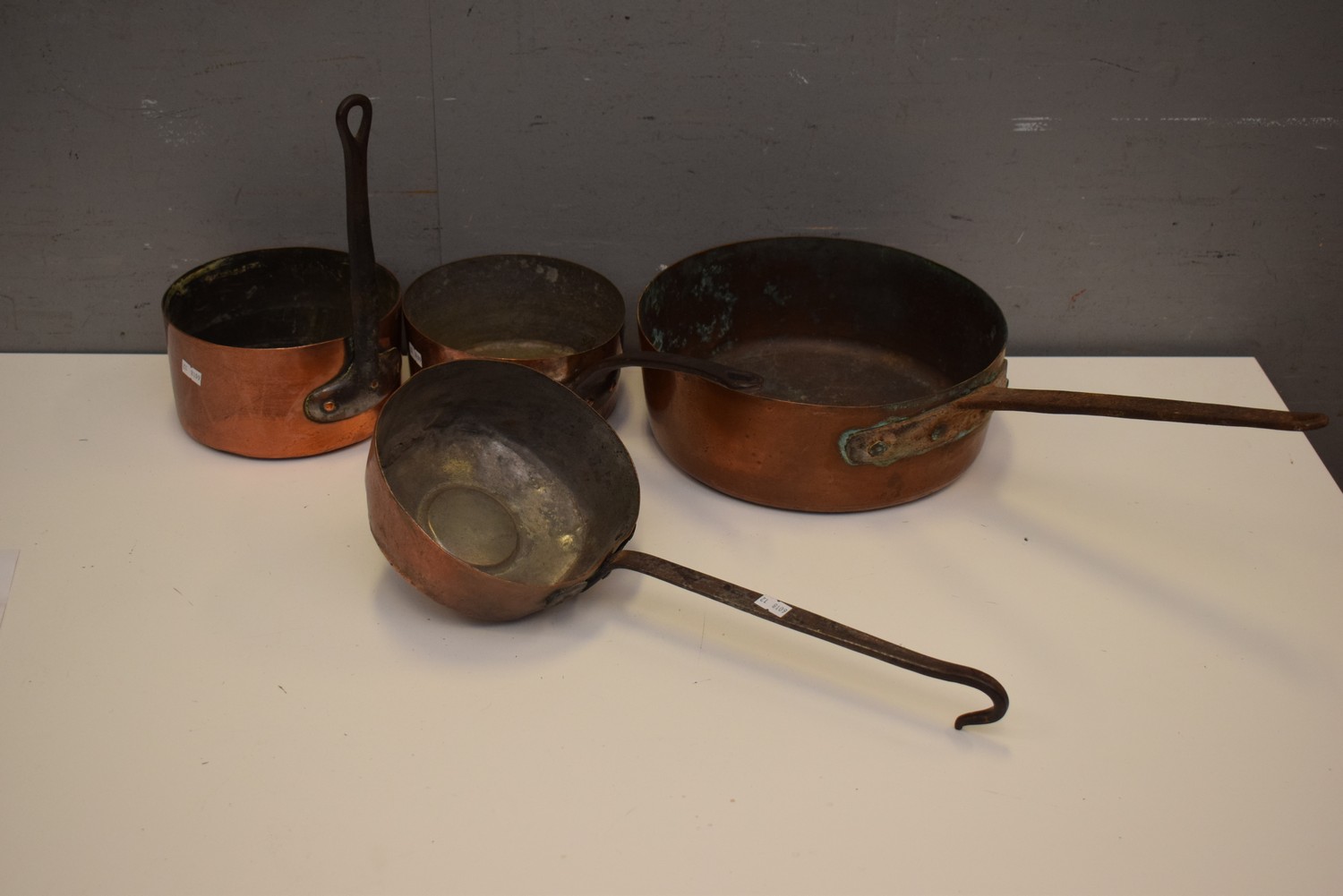 A COLLECTION OF FOUR COPPER SAUCEPANS (LARGEST 55W CM) (LEONARD JOEL DELIVERY SIZE: MEDIUM)