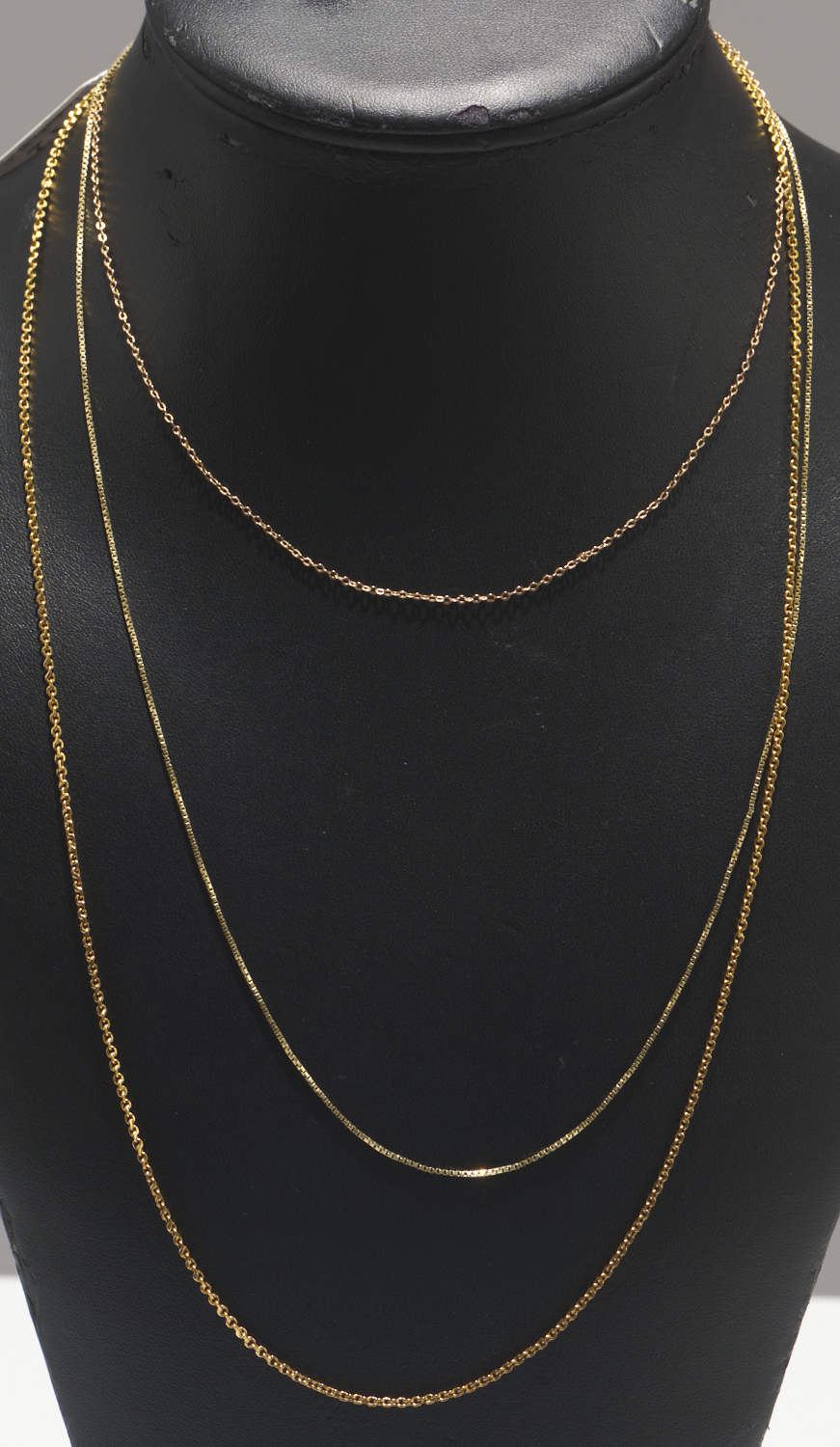 A CABLE CHAIN IN 9CT GOLD, TOTAL LENGTH 45CM; A BOX CHAIN IN 14CT GOLD, TOTAL LENGTH 56CM AND A CABLE CHAIN IN 21CT, TOTAL LENGTH 63CM