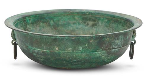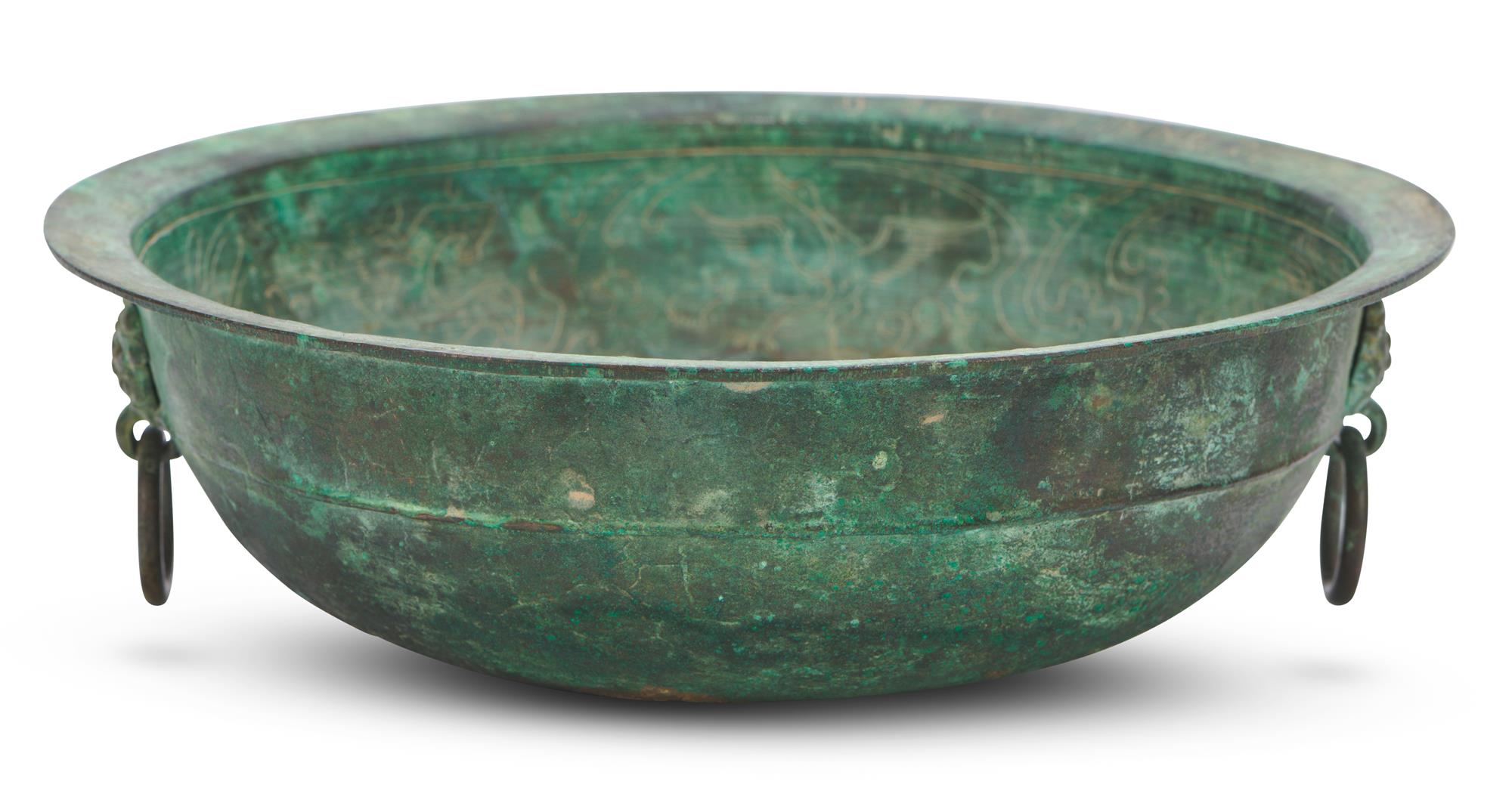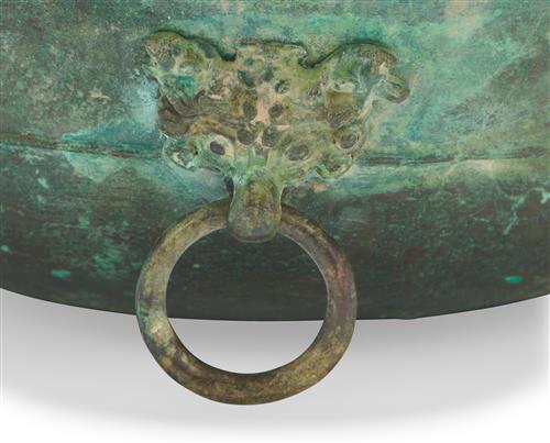 Decorated with incised decoration around the cavetto of birds and beasts surrounded by scrolling foliage, two taotie mask and ring handles, and an archaic inscription to the rim, the whole covered in a beautiful verdigris patina.