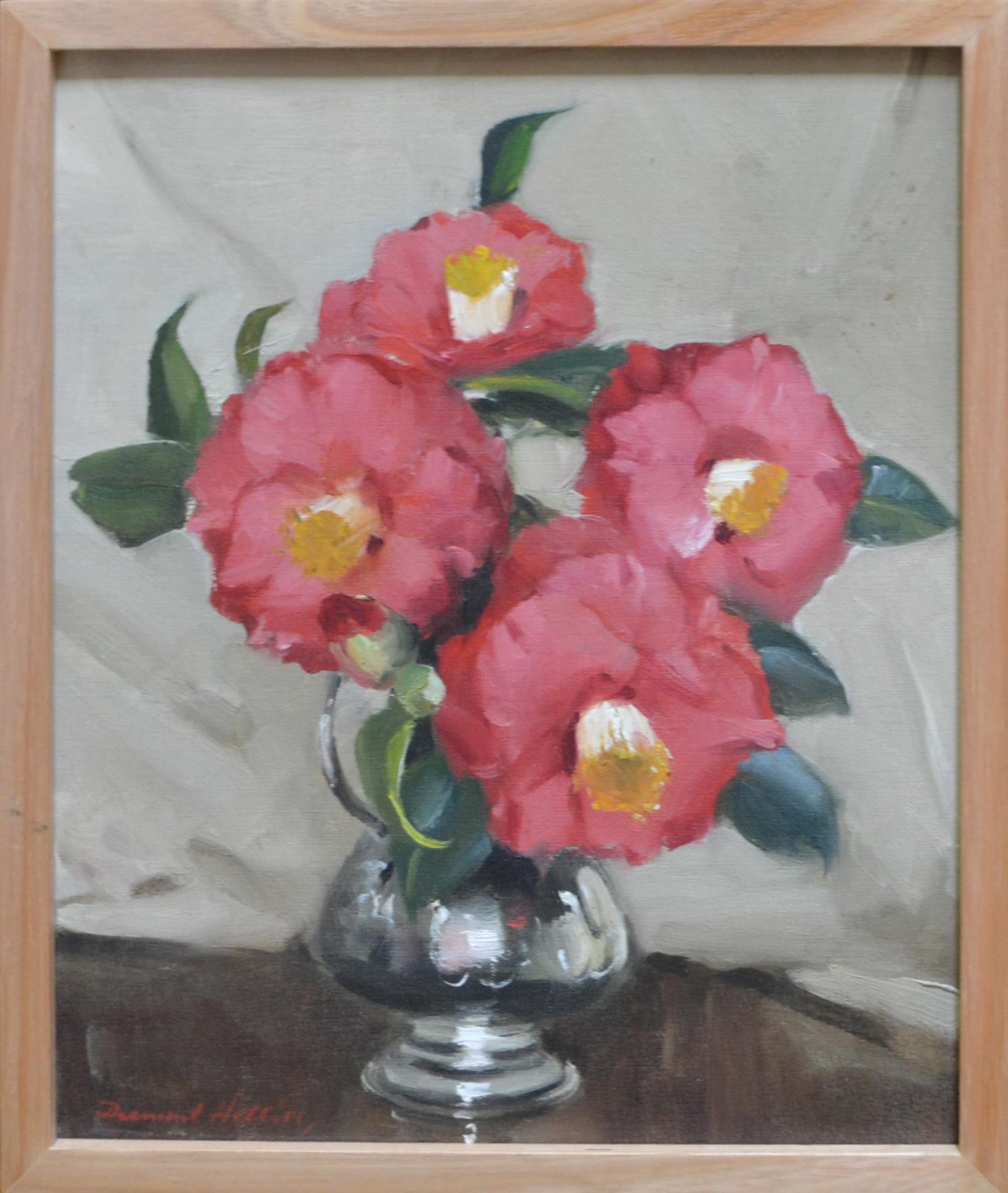 DERMONT HELLIER, CAMELIAS, OIL ON CANVASBOARD, 34 X 29CM, LEONARD JOEL DELIVERY SIZE: SMALL