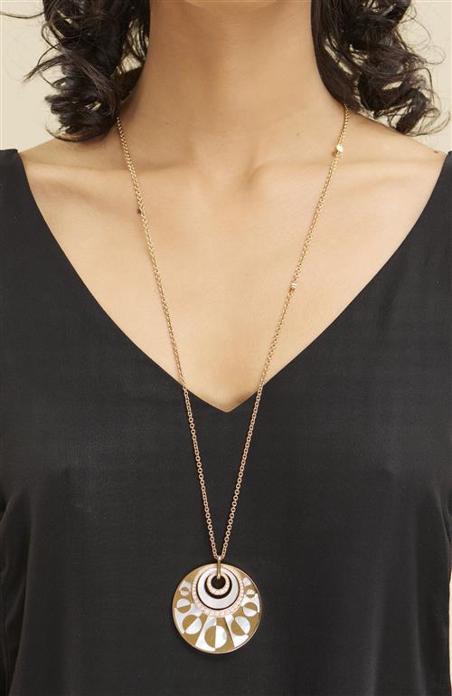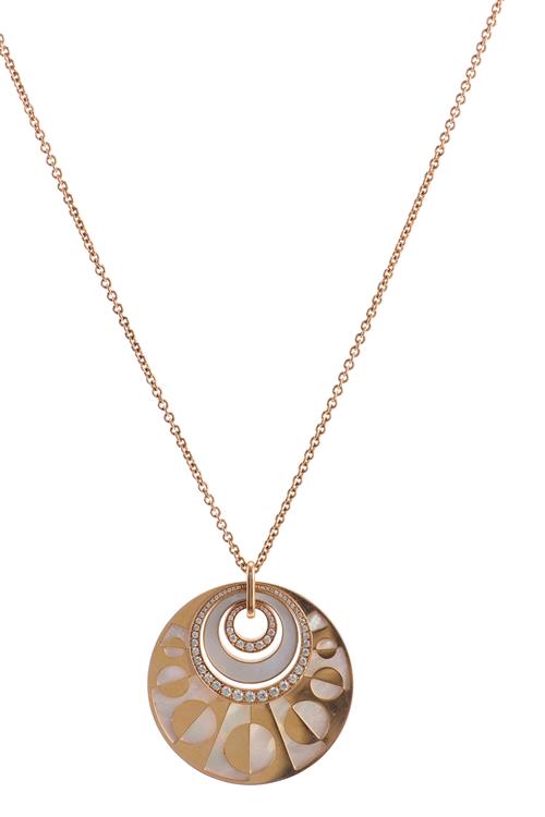 Designed as three circular motifs set within each other, applied with mother-of-pearl inlay and alternating with round brilliant-cut diamonds together weighing approximately 1.41 carats, to an adjustable belcher link chain length 612mm to 911mm, signed Bulgari and numbered AY18F6, accompanied by a Bulgari receipt and box.