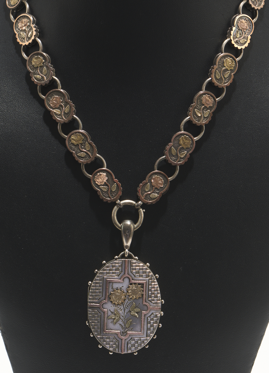 AN ANTIQUE STERLING SILVER AND ROSE GOLD INLAY LOCKET NECKLACE, HALLMARKED BIRMINGHAM CIRCA 1906-1907