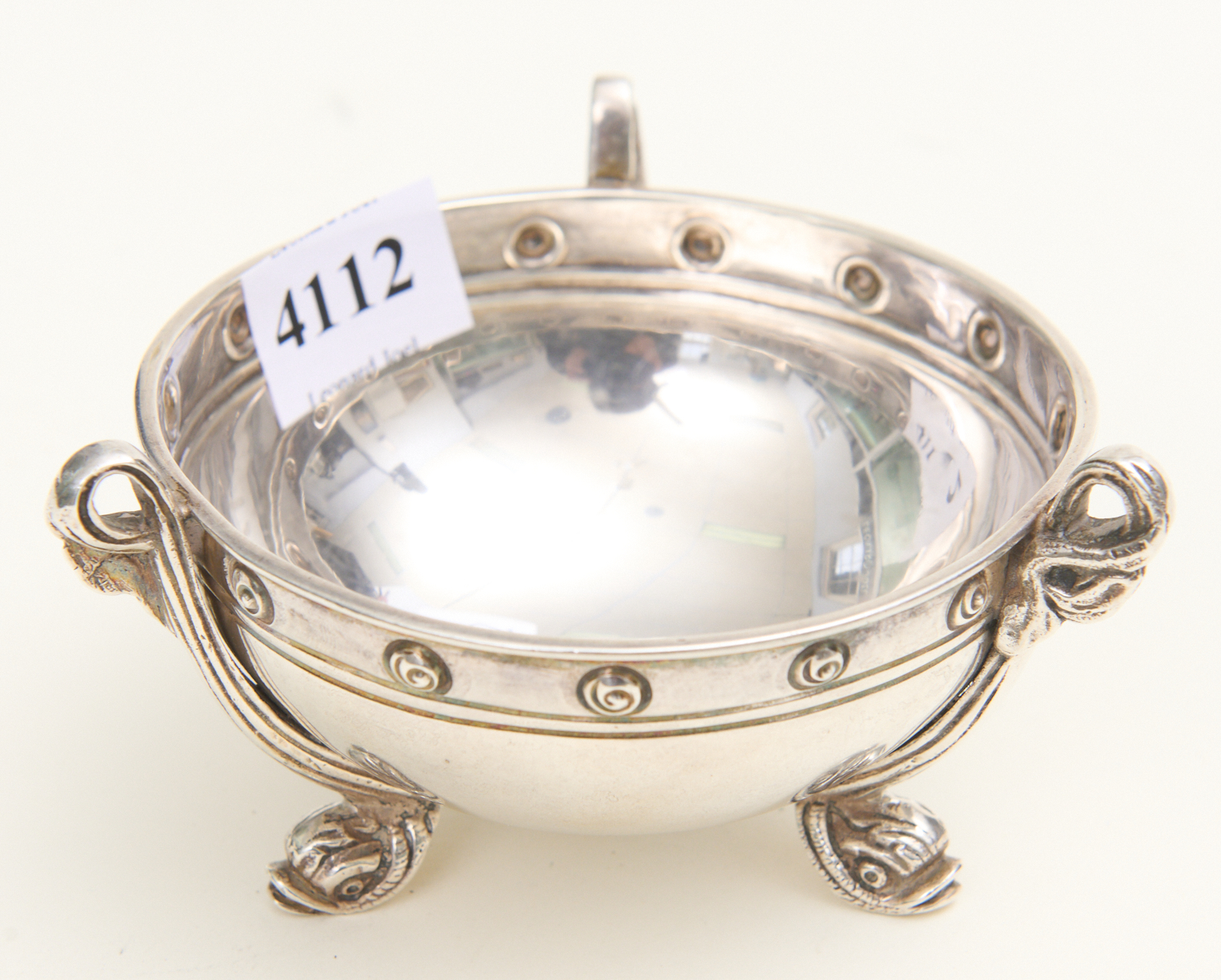 AN IRISH STERLING SILVER BOWL ON THREE DOLPHIN FORM FEET (8 CM D), LEONARD JOEL LOCAL DELIVERY SIZE: SMALL