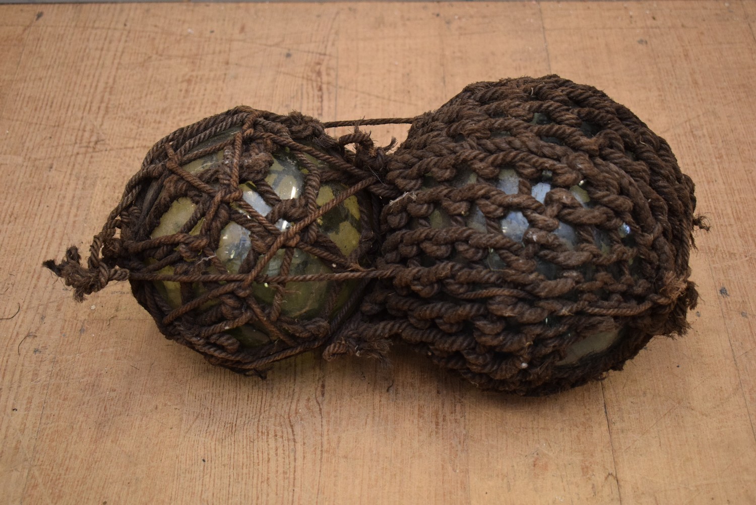 VINTAGE 1920S NATURAL FIBRE BOUND DOUBLE GLASS FISHING FLOAT BOY IN RARE GREEN GLASS (46W CM) (LEONARD JOEL DELIVERY SIZE: MEDIUM)