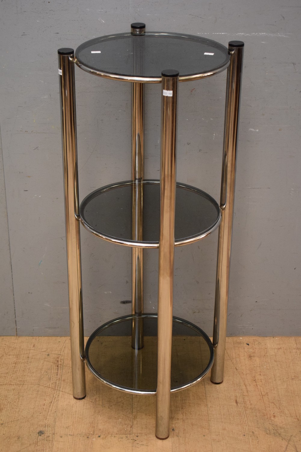 A 1960S RETRO ROUND CHROME AND GLASS THREE TIER DISPLAY STAND WHATNOT (103H X 46 DIAMETER CM) (LEONARD JOEL DELIVERY SIZE: LARGE)