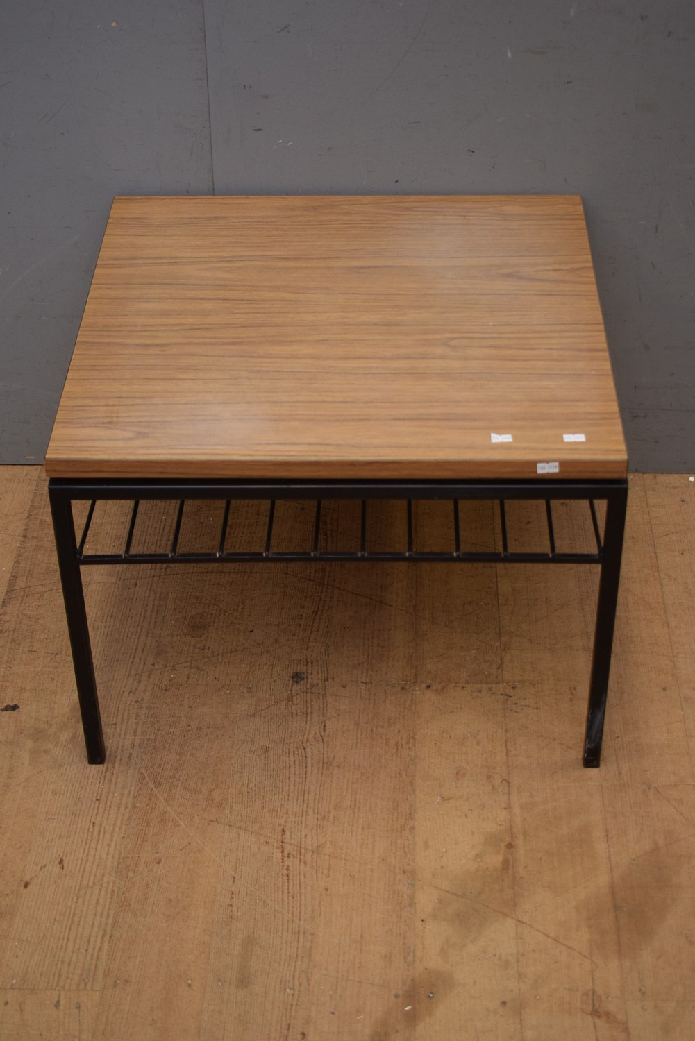 A RETRO AUSTRALIAN STEEL FRAMED MELAMINE TOPPED ARISTOC SQUARE COFFEE TABLE WITH MAGAZINE RACK UNDERNEATH ( 44H X 60W X 60D CM) (LEONARD JOEL DELIVERY SIZE: MEDIUM)