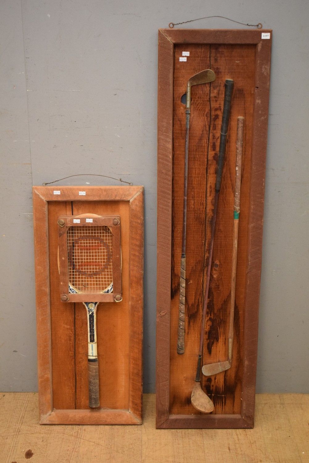 2 WOODEN FRAMED SPORTS DISPLAY WALL HANGINGS – ONE WITH GOLF CLUBS THE OTHER WITH TENNIS RACKET (LARGEST 138H x 36D CM) (LEONARD JOEL DELIVERY SIZE: MEDIUM)