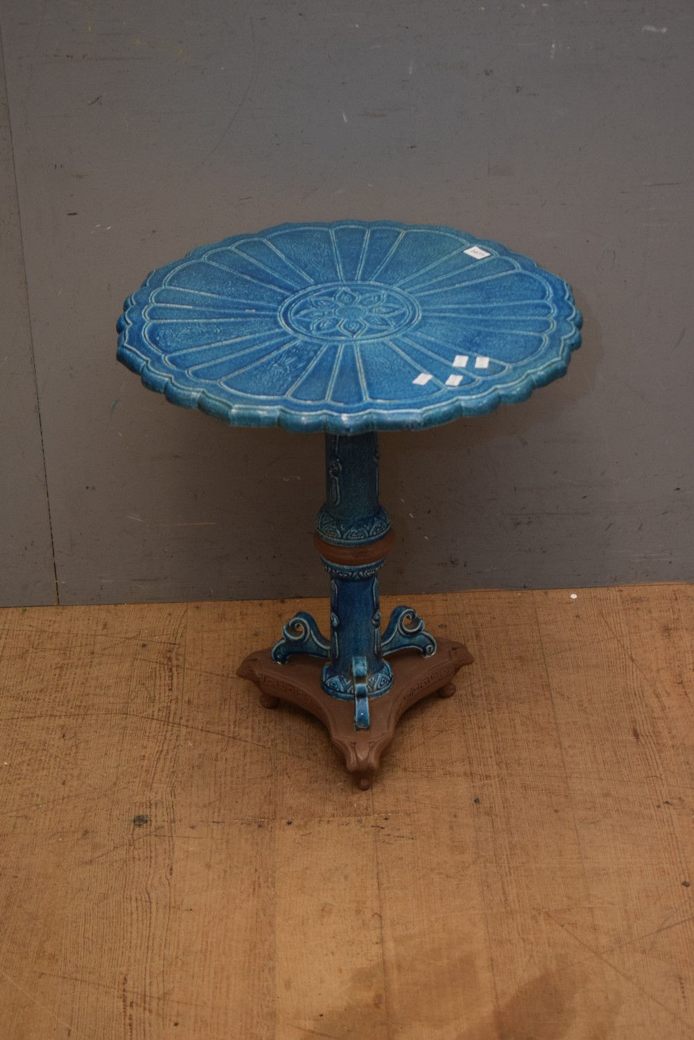 AN ITALIAN TURQUOISE GLAZED CERAMIC PEDESTAL COFFEE TABLE - SIGNED UNDERNEATH BASE (52H x 50D CM) (LEONARD JOEL DELIVERY SIZE: MEDIUM)