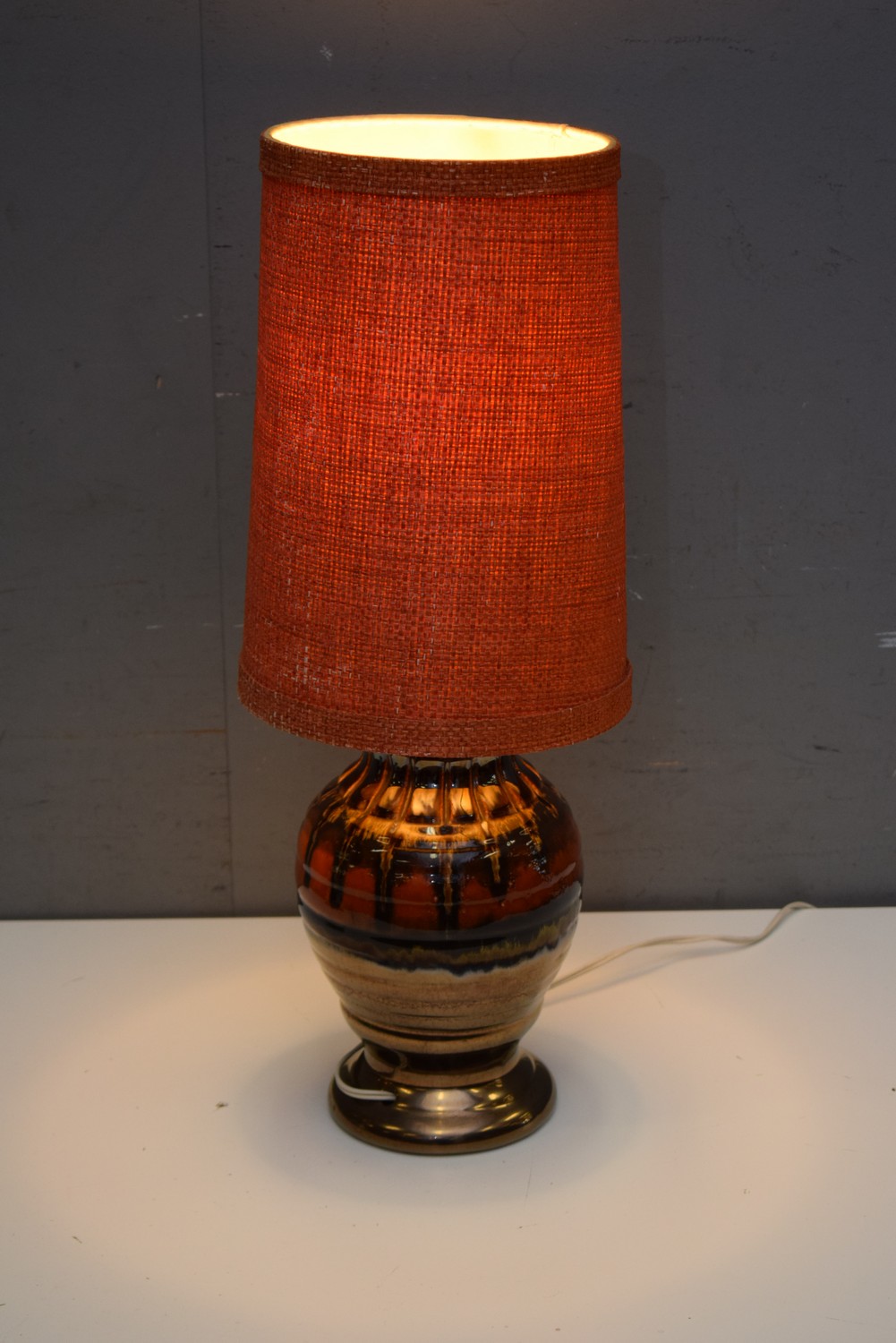 SMALL AUSTRALIAN RETRO ELLIS POTTERY LAMP BASE WITH ORIGINAL WOVEN FABRIC SHADE (62H CM) (LEONARD JOEL DELIVERY SIZE: MEDIUM)