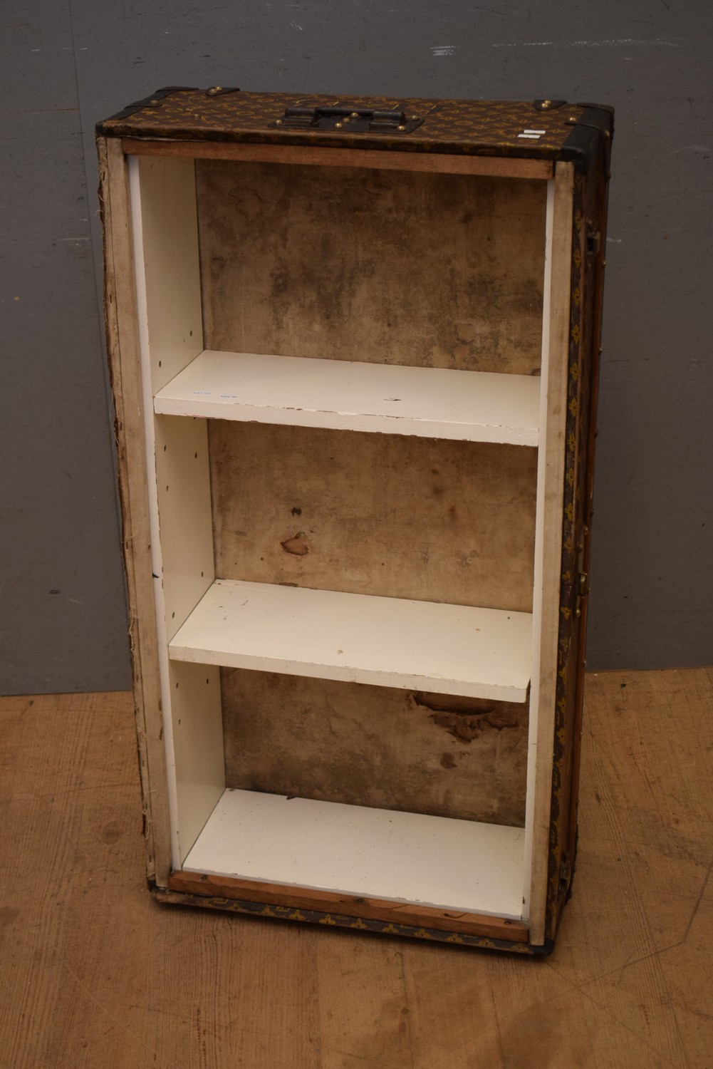 A RARE 19TH CENTURY ORIGINAL LOUIS VUITTON CASE BASE CONVERTED TO BOOKSHELF WITH ORIGINAL HANDLES AND FULLY SIGNED ( 103W X 53W X 25D CM) (LEONARD JOEL DELIVERY SIZE: LARGE)