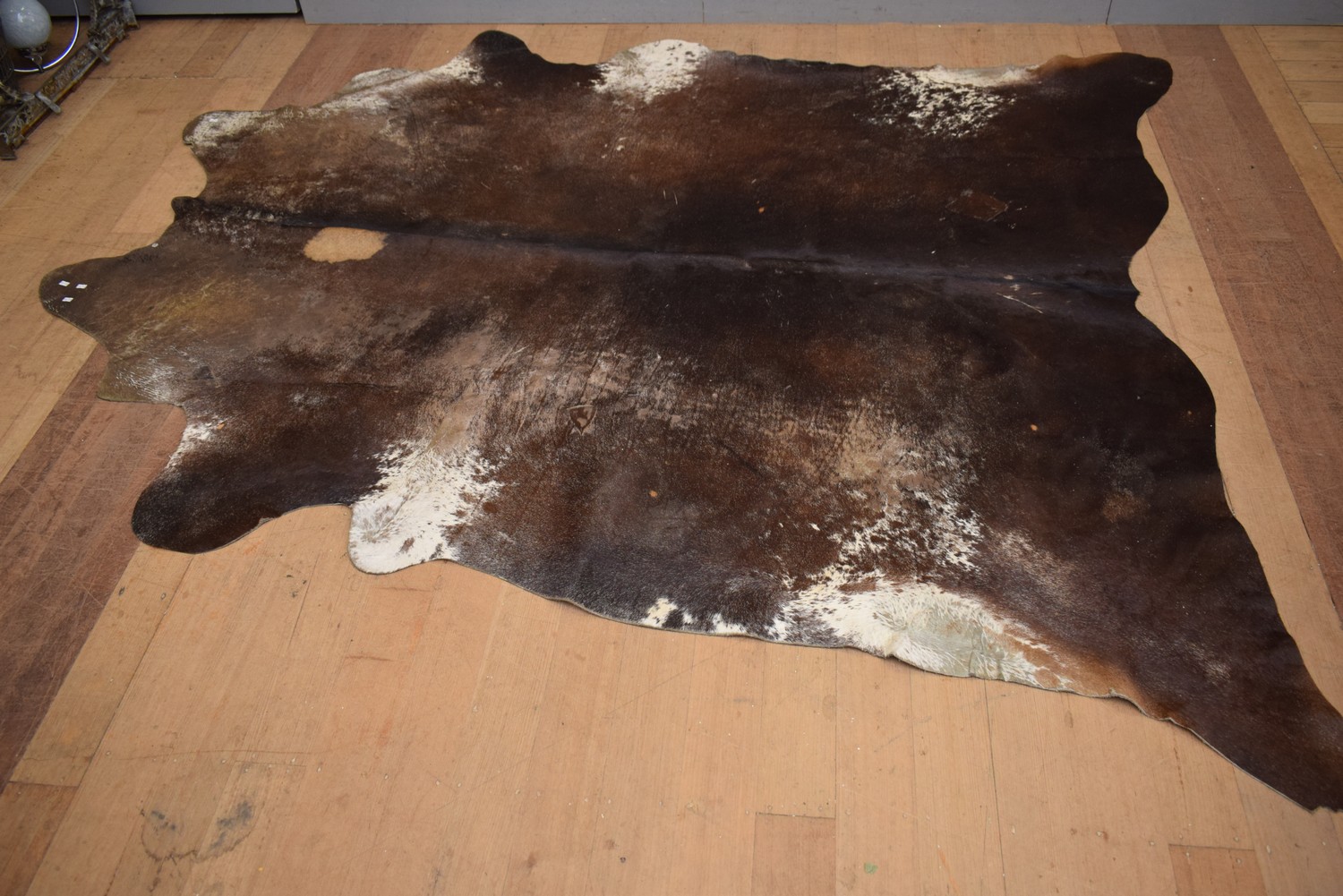 A LARGE GENUINE DARK BROWN AND GREY COW SKIN RUG ( 216 X 250 CM) (LEONARD JOEL DELIVERY SIZE: LARGE)