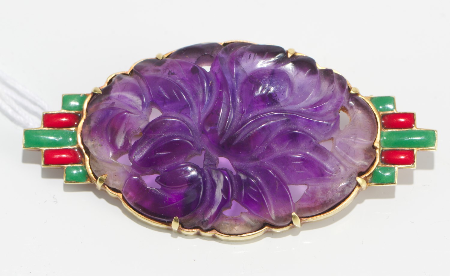A CARVED AMETHYST AND ENAMEL BAR BROOCH IN 14CT GOLD