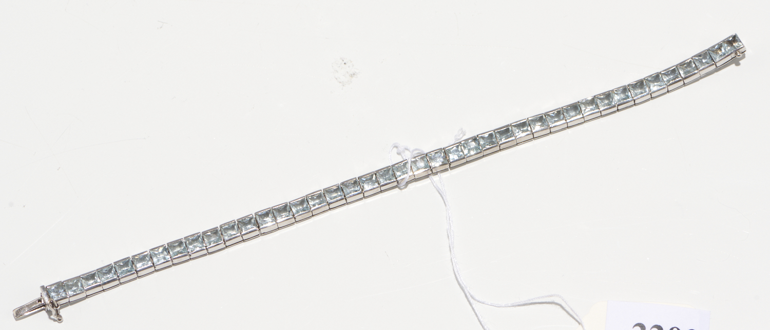AN AQUAMARINE TENNIS BRACELET IN 18CT GOLD BY RUTHERFORD