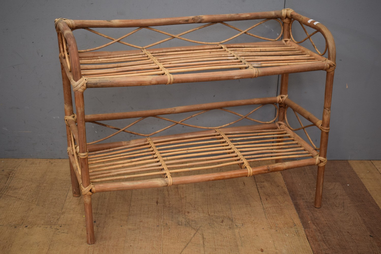 A WICKER TWO TIER SHOE RACK (A/F) ( 59H X 76W X 32D CM) (LEONARD JOEL DELIVERY SIZE: MEDIUM)