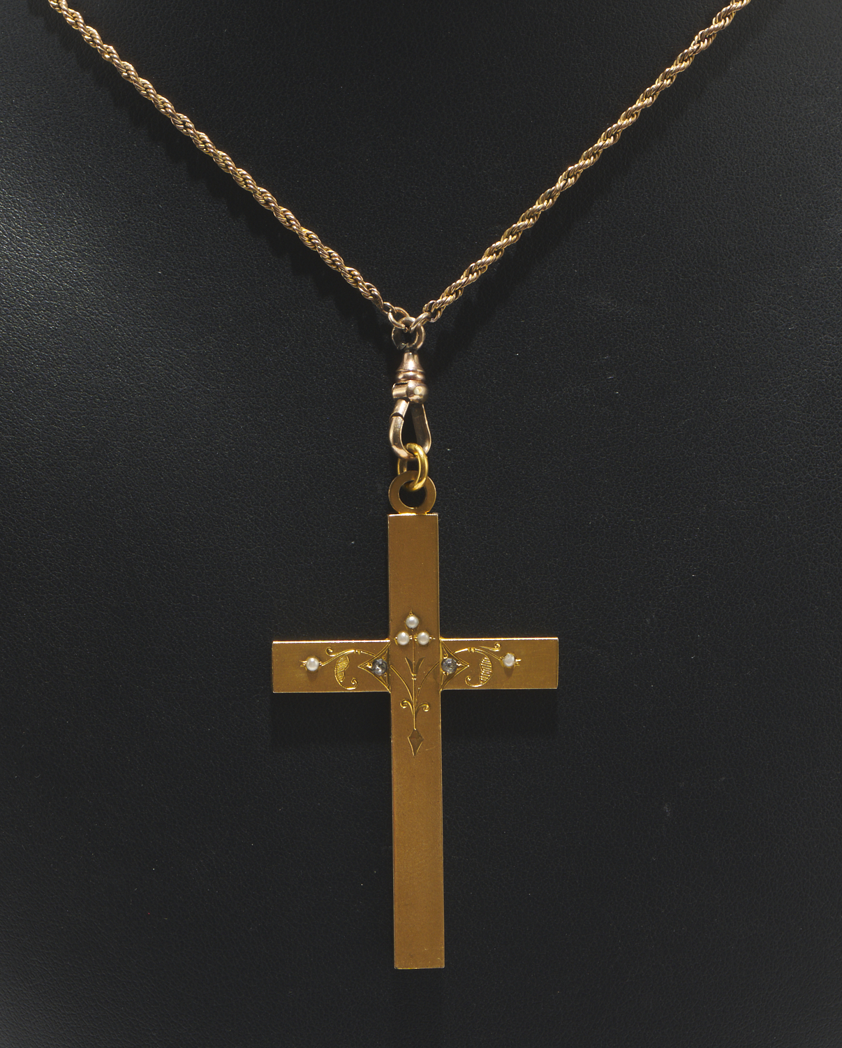 A SEED PEARL CROSS TO A SLIDE CHAIN IN GOLD LINED BASE METAL, CHAIN LENGTH 620MM
