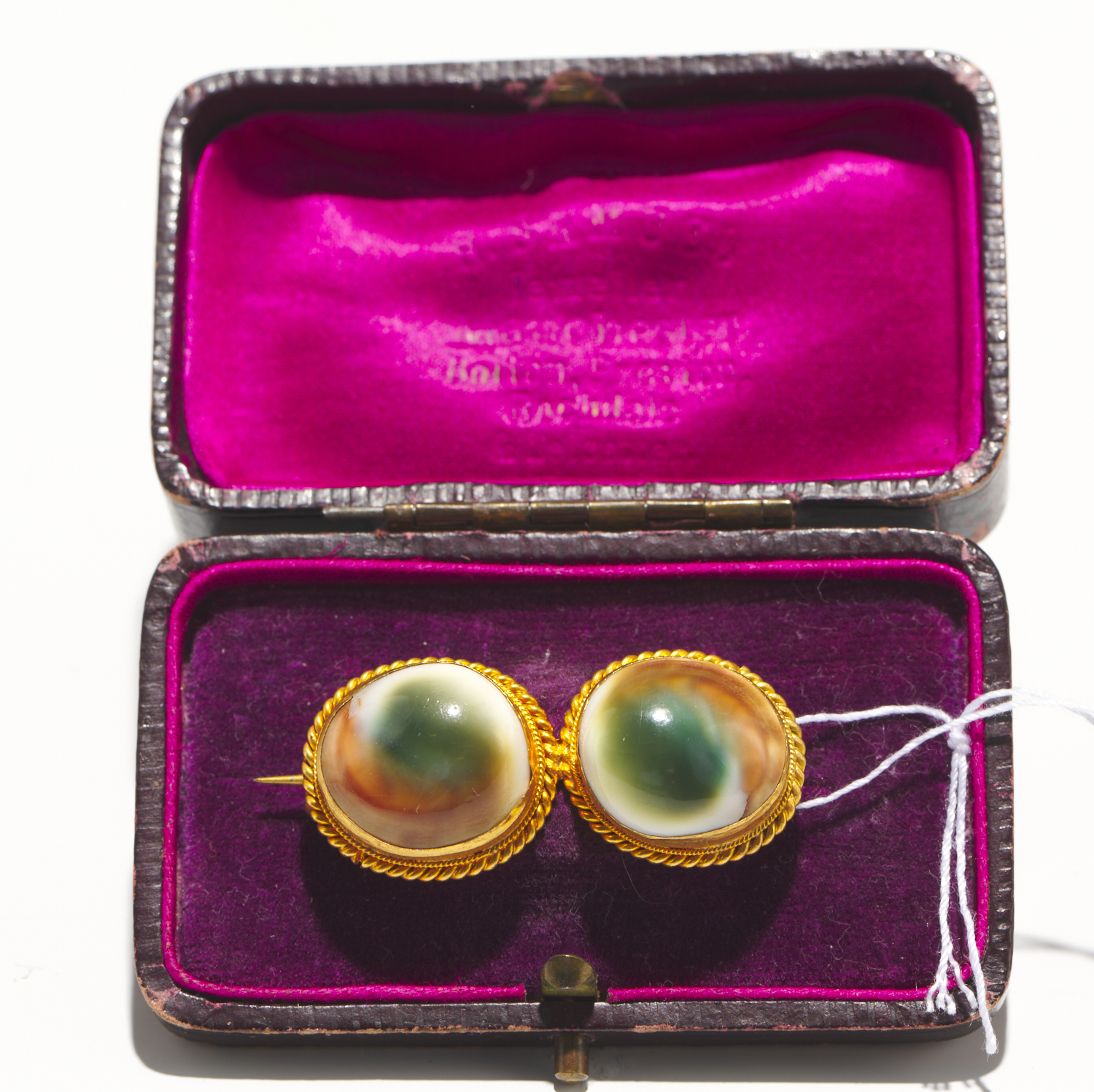 AN AUSTRALIAN OPERCULUM BROOCH IN GILT, LENGTH 42MM