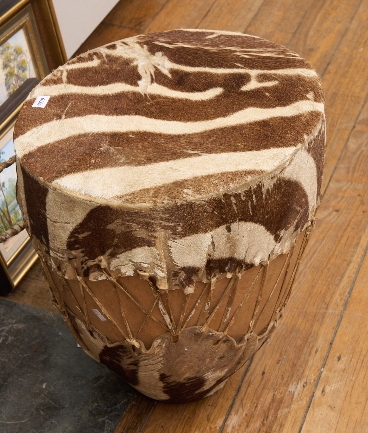 AN AFRICAN ZEBRA HIDE DRUM H.50CM, LEONARD JOEL LOCAL DELIVERY SIZE: SMALL