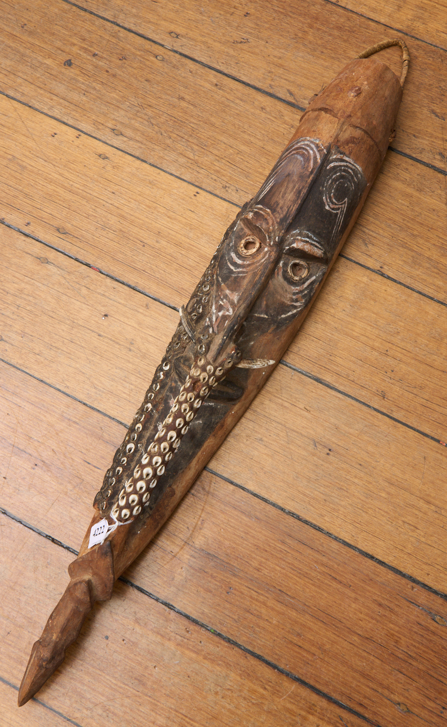 A PNG MASK WITH COWRIE SHELL INLAY AND BOAR TUSKS (A/F) W.64CM, LEONARD JOEL LOCAL DELIVERY SIZE: SMALL