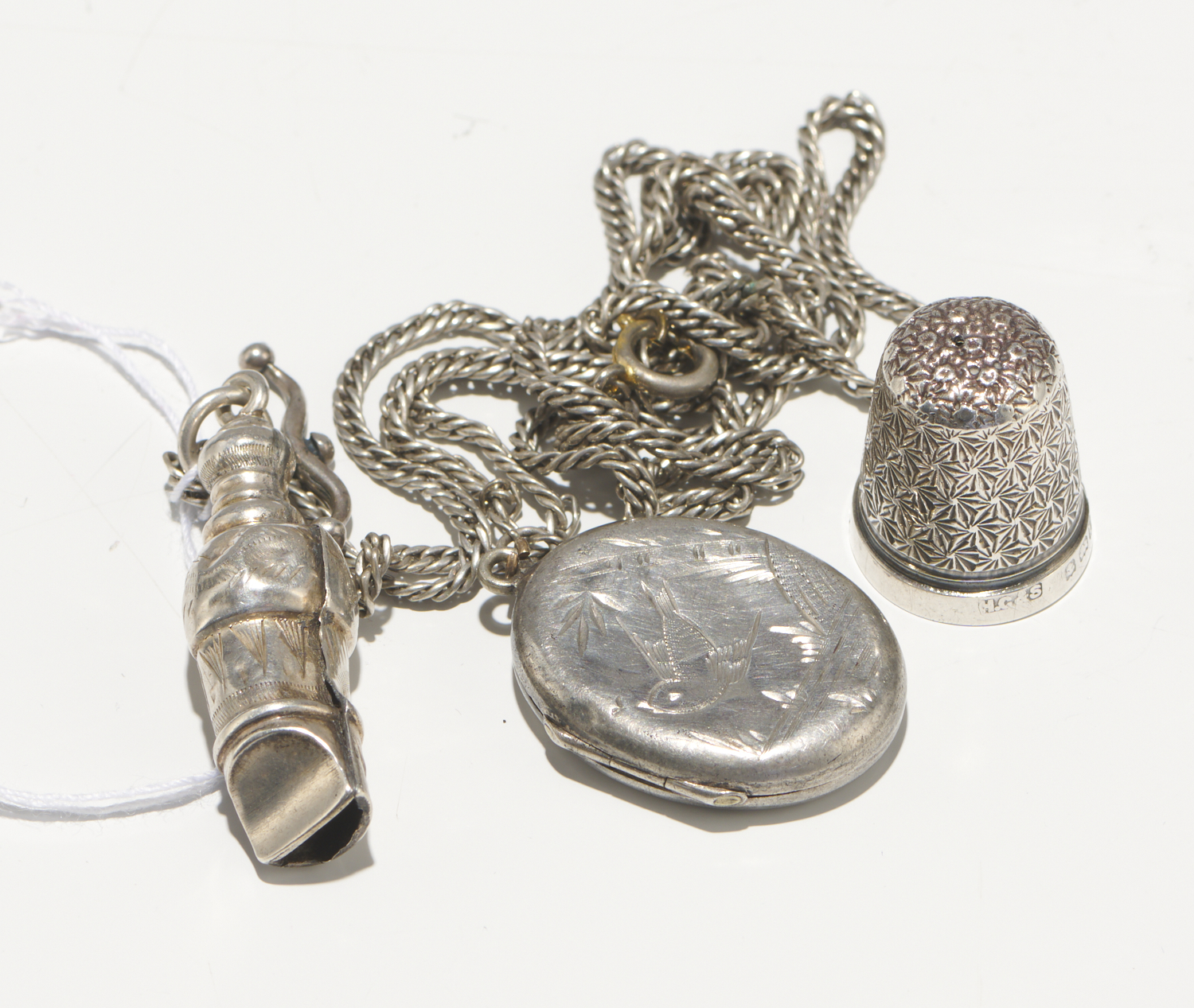 A COLLECTION OF SILVER FINDINGS, INCLUDING A LOCKET AND CHAIN, A THIMBLE AND A WHISTLE