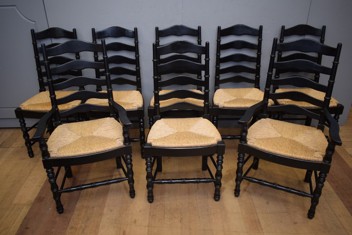 A SET OF EIGHT EBONISED AND RATTAN DINING CHAIRS (108H x 59W x 59D CM) (LEONARD JOEL DELIVERY SIZE: LARGE)