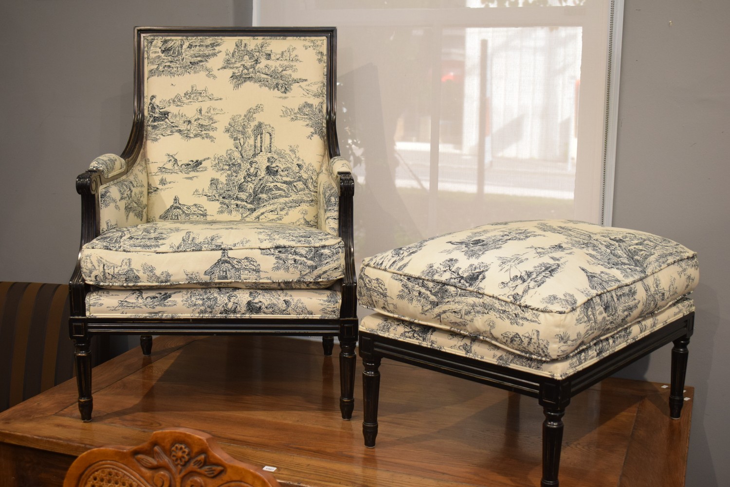 A CONTEMPORARY LOUIS XVI STYLE ARMCHAIR WITH MATCHING OTTOMAN (A/F) (H96 X W68 X D58 CM) (LEONARD JOEL DELIVERY SIZE: LARGE)