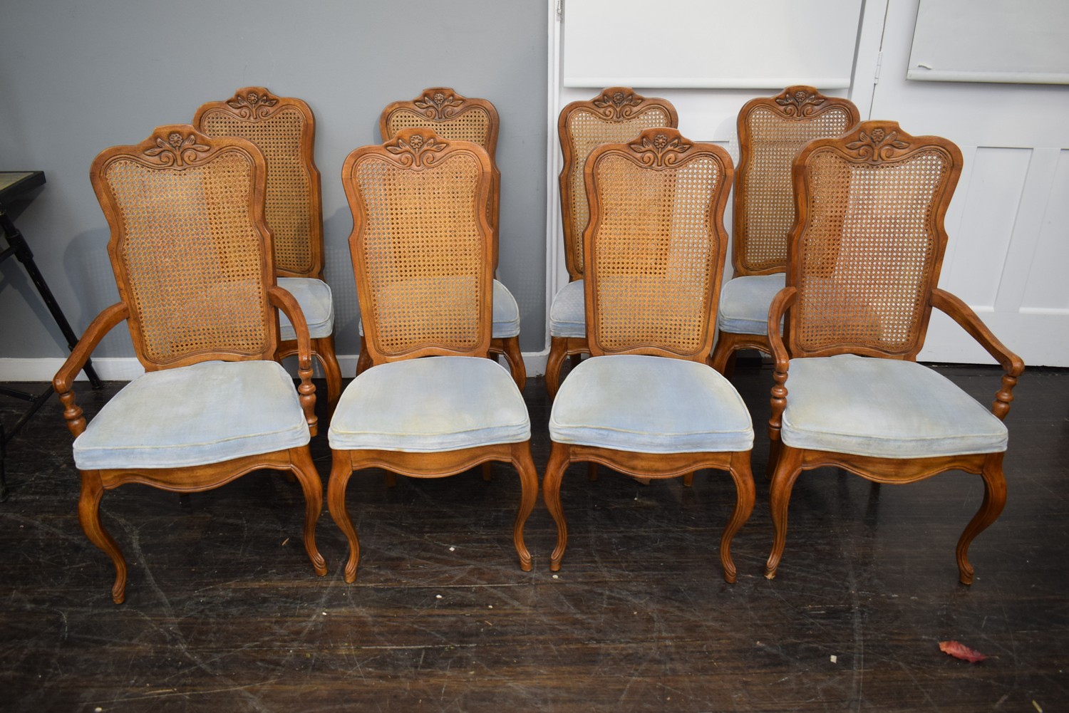 A SET OF EIGHT DREXEL RATTAN AND UPHOLSTERED DINING CHAIRS (A/F) (90H x 60W x 60D CM) (LEONARD JOEL DELIVERY SIZE: LARGE)