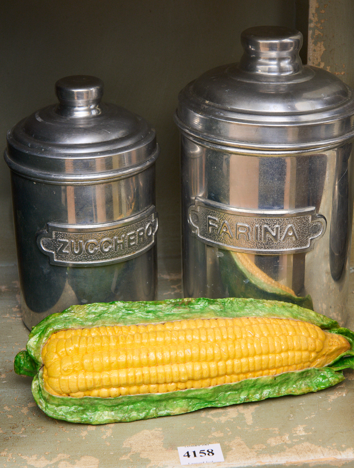 A PAIR OF MID-CENTURY ITALIAN ALUMINIUM CANISTERS (ZUCCHERO AND FARINA) AND A MOCK CORN COB, LEONARD JOEL LOCAL DELIVERY SIZE: SMALL
