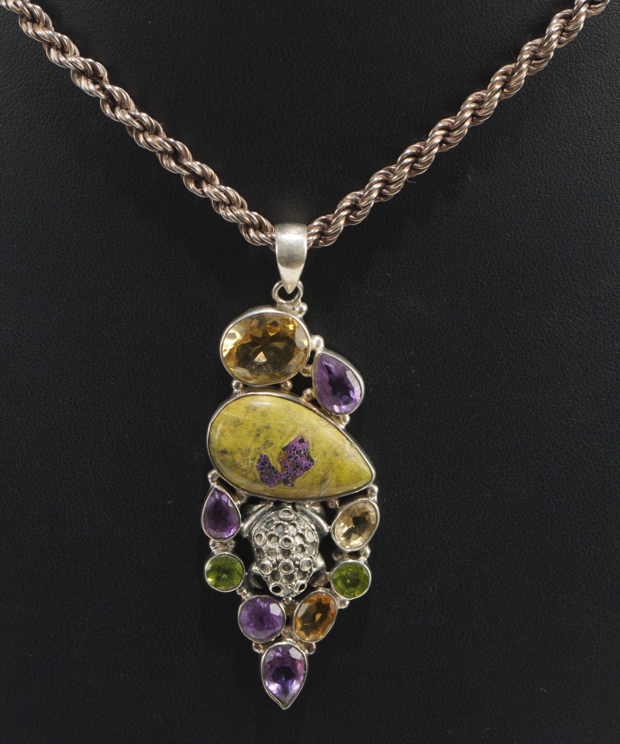 A CITRINE, PERIDOT AND AMETHYST SET PENDANT IN STERLING SILVER TO A ROPE CHAIN IN SILVER
