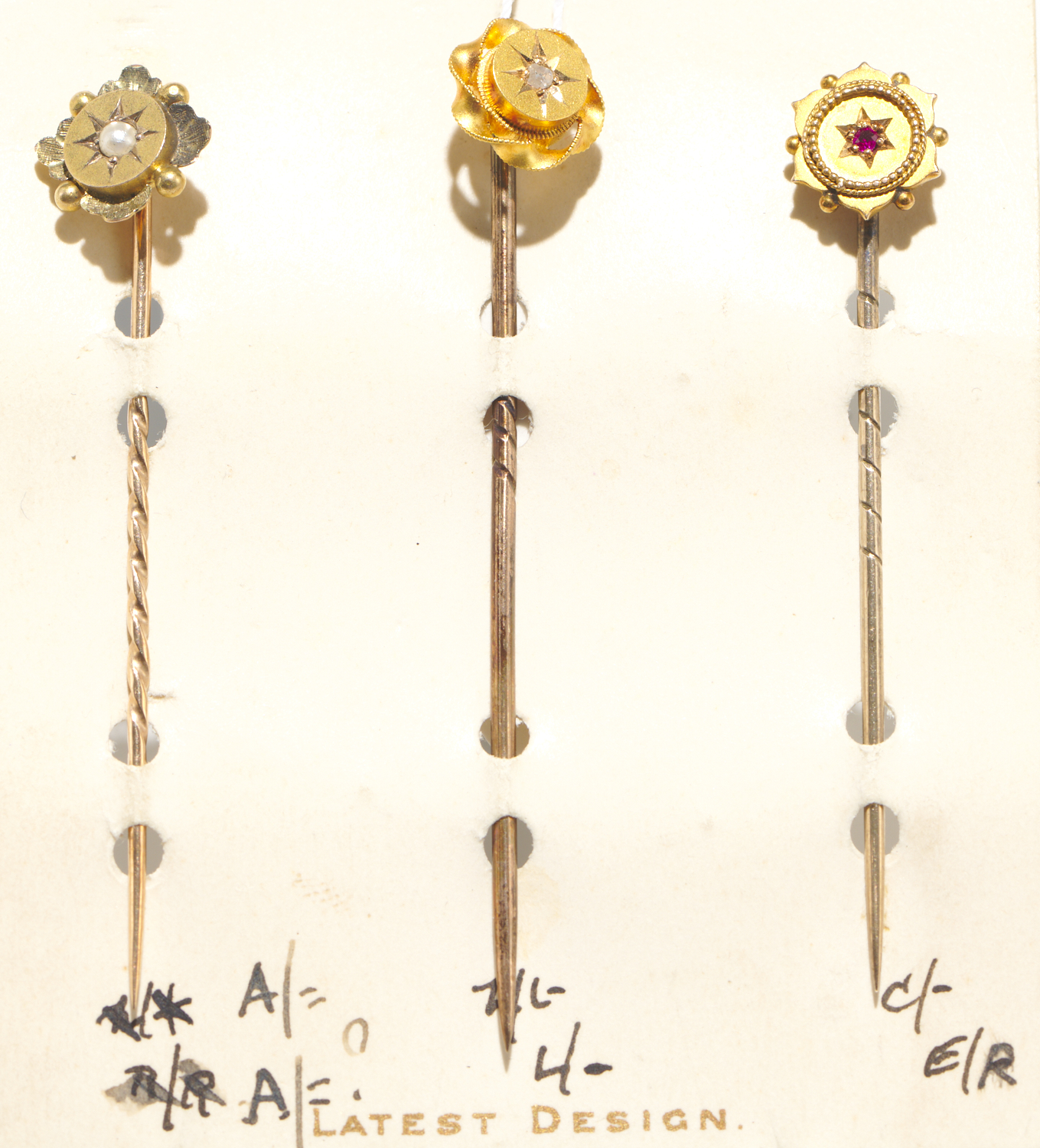 A COLLECTION OF THREE STICK PINS IN 9CT GOLD, WITH CENTRAL SEED PEARL, DIAMOND AND GARNET DETAILS