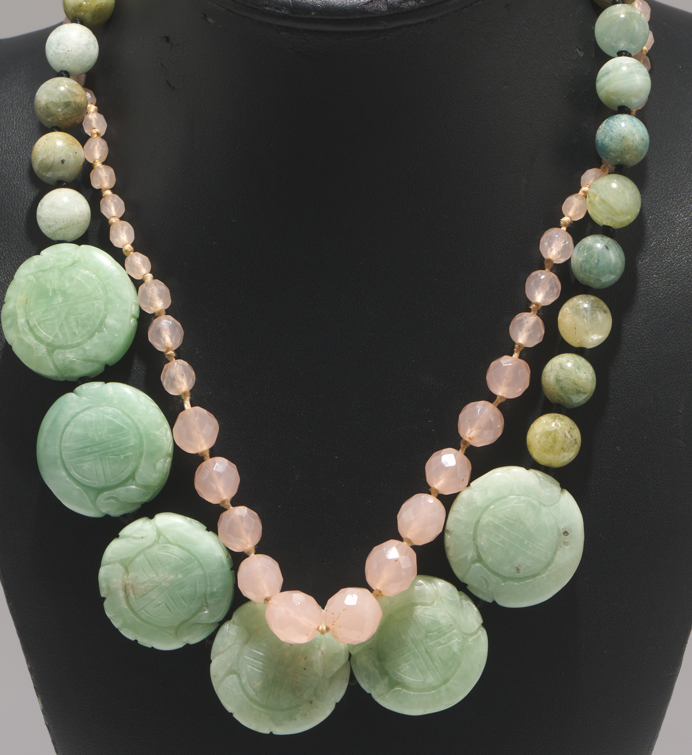 A JADE NECKLACE AND A ROSE QUARTZ NECKLACE