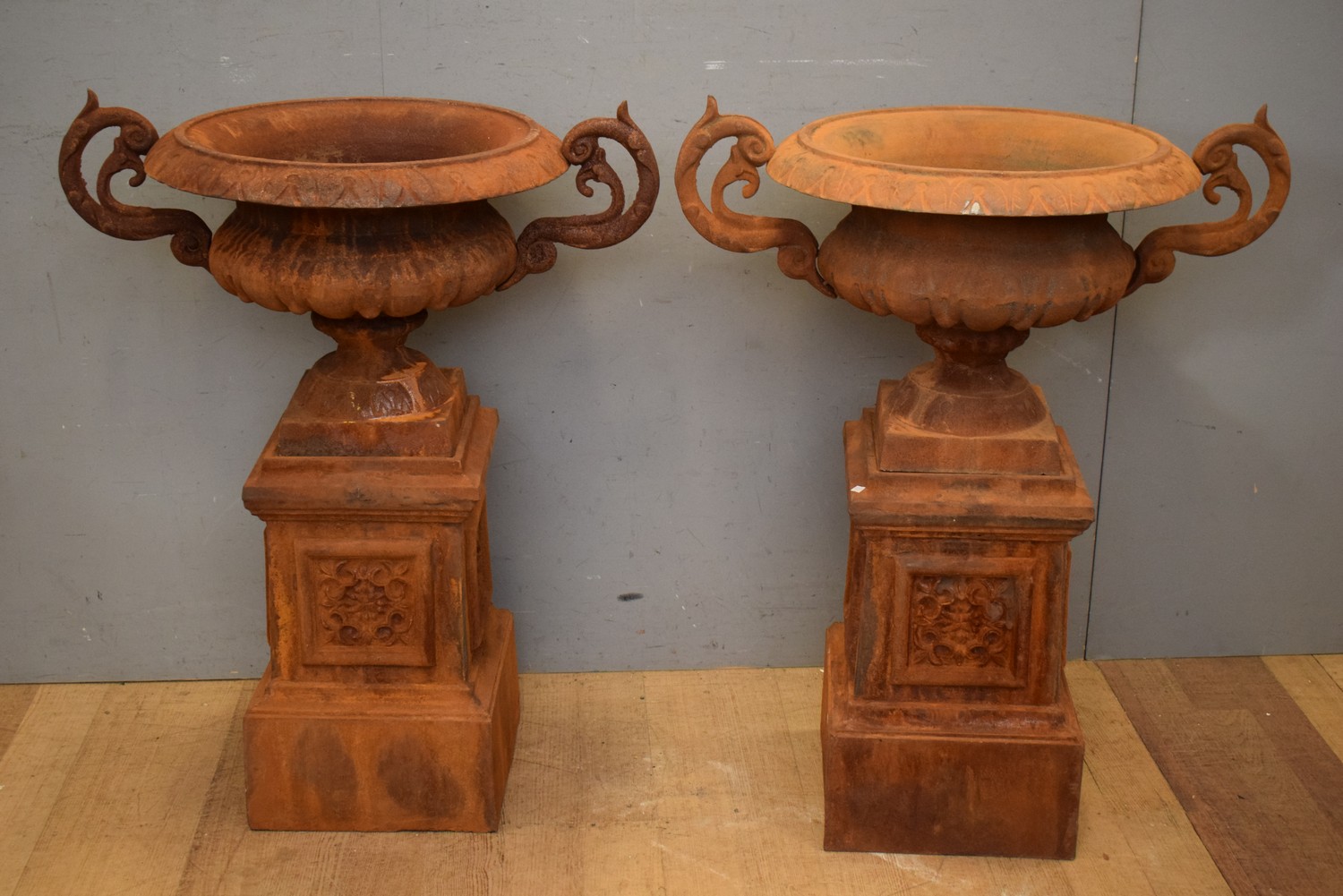 A PAIR OF ORNATE CAST IRON GARDEN URNS (H97 X W80 CM) (PLEASE NOTE THIS HEAVY ITEM MUST BE REMOVED BY CARRIERS AT THE CUSTOMER'S EXPENSE. LEONARD JOEL STAFF CANNOT ASSIST CARRYING THIS ITEM) (X-LARGE ITEM)