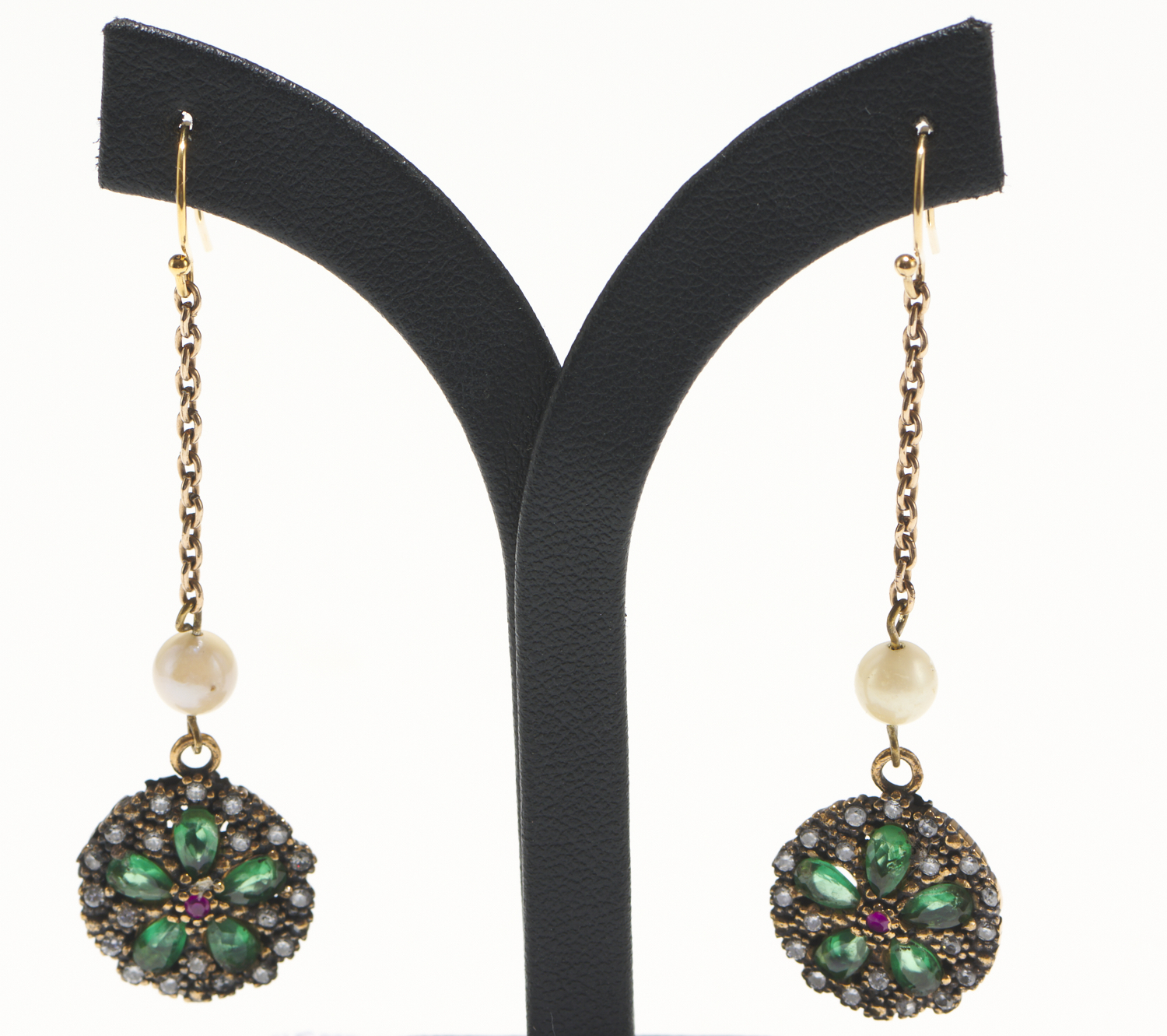 A PAIR OF CULTURED PEARL AND PASTE SILVER GILT EARRINGS