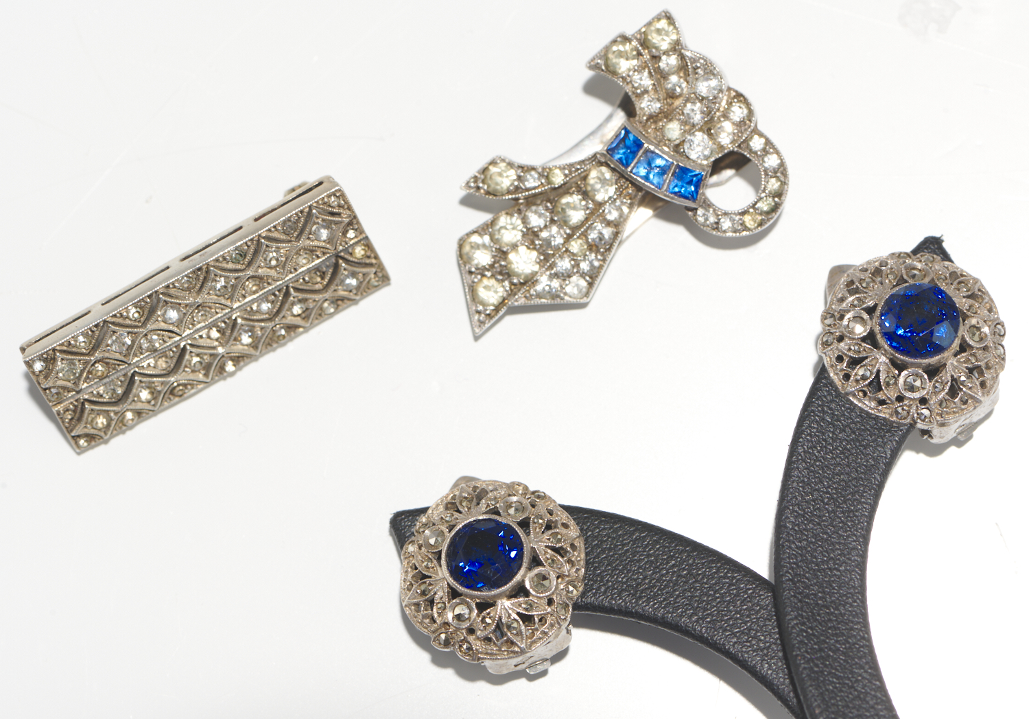 TWO PASTE SET ART DECO BROOCHES IN SILVER AND A PAIR OF FRENCH SILVER AND MARCASITE AND PASTE SET EARRINGS
