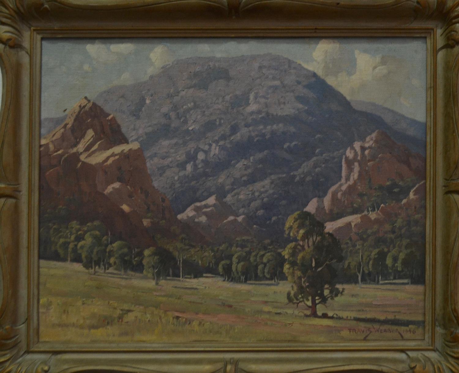 TRAVIS WEBBER, LANDSCAPE WITH HILLS 1946, OIL ON BOARD, 37 X 46CM, LEONARD JOEL DELIVERY SIZE: SMALL