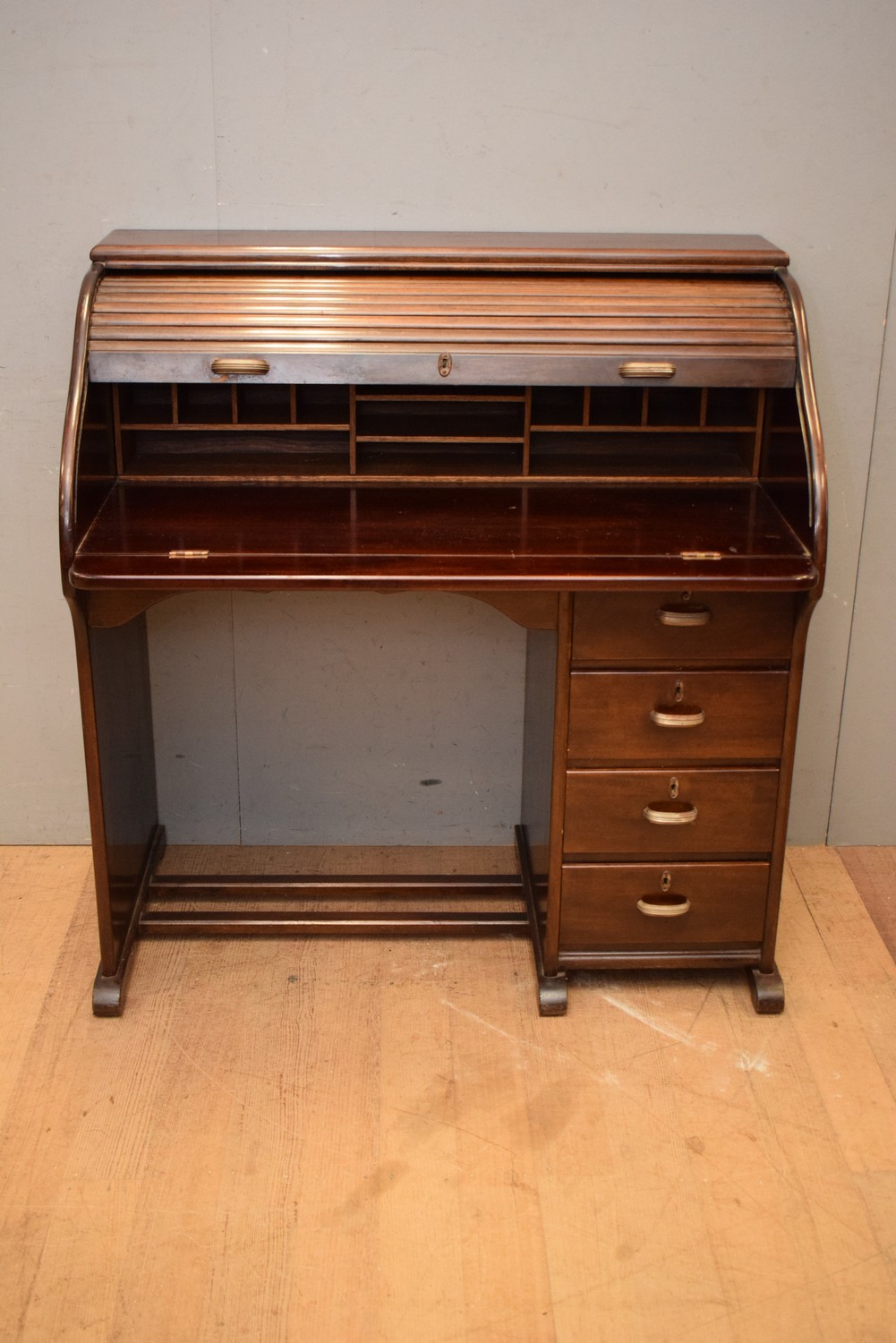 A MAHOGANY ROLL TOP DESK CIRCA 1915 ( 113H X 107W X 57D CM) (PLEASE NOTE THIS HEAVY ITEM MUST BE REMOVED BY CARRIERS AT THE CUSTOMER'S EXPENSE. LEONARD JOEL STAFF CANNOT ASSIST CARRYING THIS ITEM) (X-LARGE ITEM)