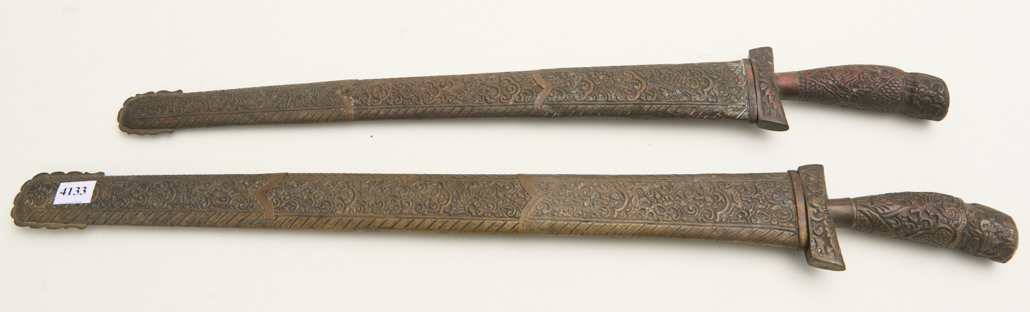 19TH CENTURY INDONESIAN KRIS SWORDS WITH EMBOSSED SHEATHS AND INLAID BLADES L.65CM, PLEASE NOTE: VICTORIAN EDGED WEAPONS LICENSE REQUIRED TO PURCHASE, LEONARD JOEL LOCAL DELIVERY SIZE: SMALL