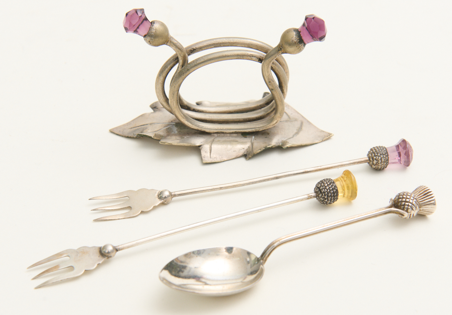 A GROUP OF SCOTTISH ITEMS INCLUDING SILVER SPOONS, LEONARD JOEL LOCAL DELIVERY SIZE: SMALL