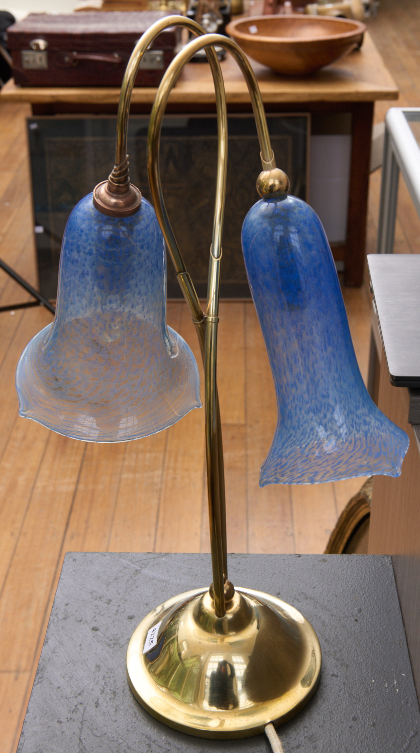 A BRASS TABLE LAMP WITH BLUEBELL STYLE GLASS SHADES (50 CM H), LEONARD JOEL LOCAL DELIVERY SIZE: SMALL