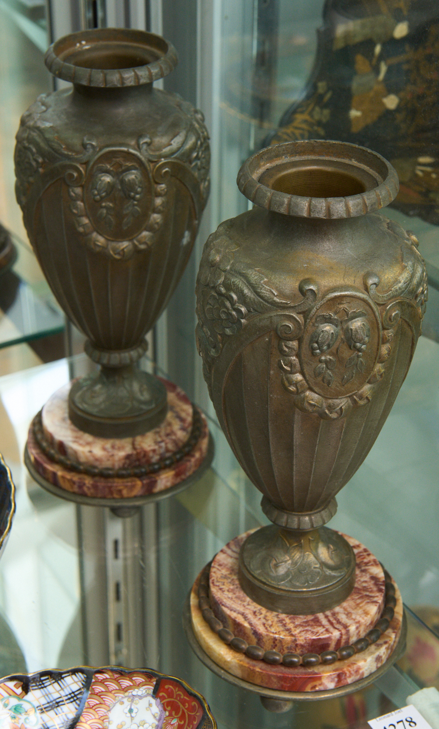 A PAIR OF FRENCH EMBOSSED METAL VASES ON MARBLE BASES H.26.5CM, LEONARD JOEL LOCAL DELIVERY SIZE: SMALL