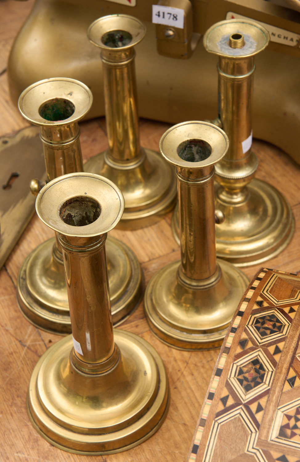 A GROUP OF BRASS CANDLEHOLDERS, LEONARD JOEL LOCAL DELIVERY SIZE: SMALL