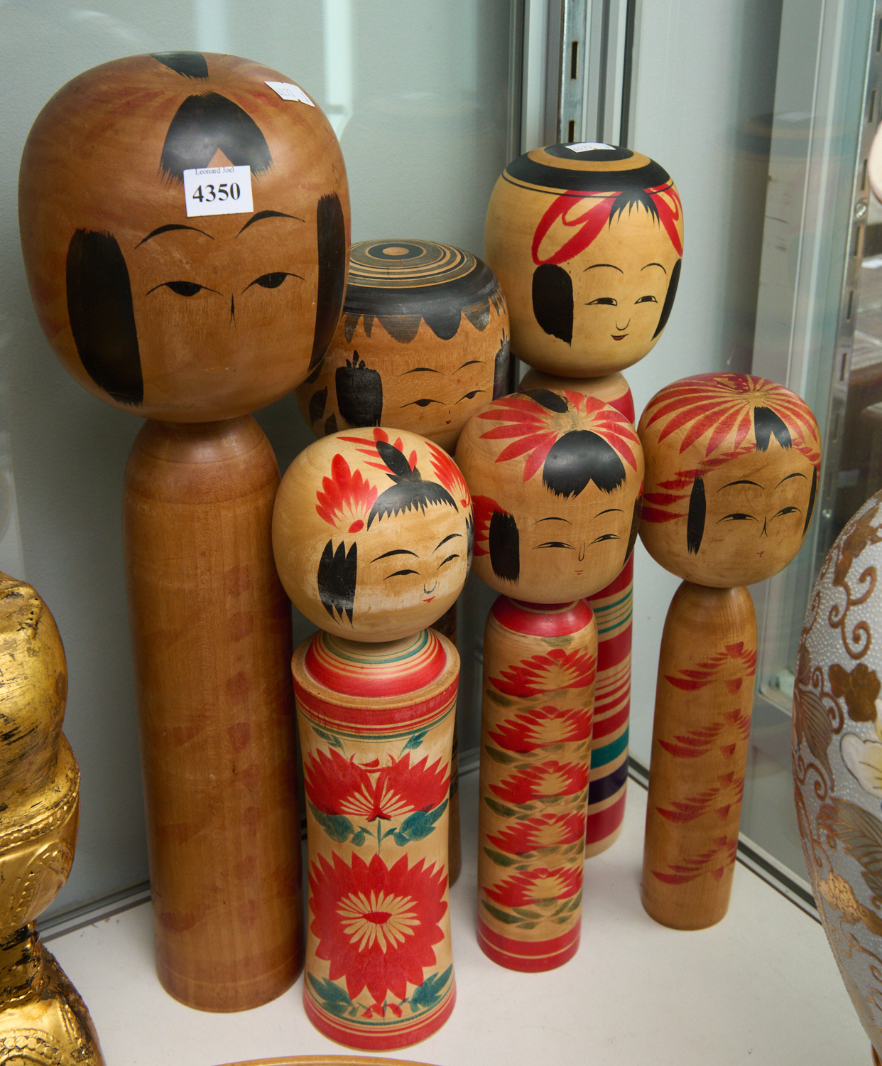 COLLECTION OF SIX VINTAGE HAND PAINTED WOODEN JAPANESE KOKESHI DOLLS H.56CM, LEONARD JOEL LOCAL DELIVERY SIZE: SMALL