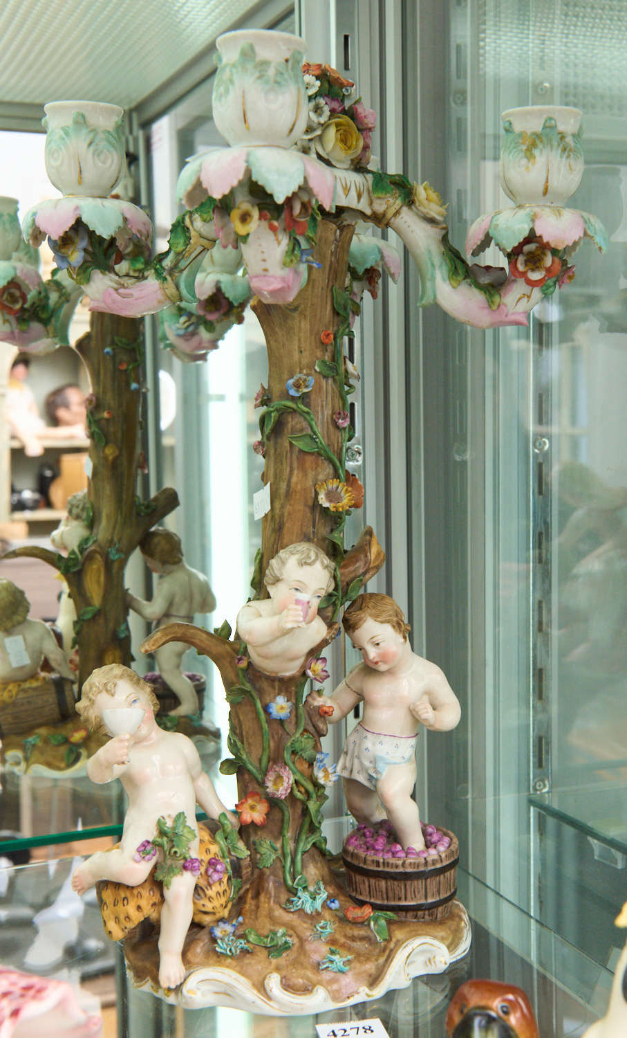 19TH CENTURY GERMAN STZENDORF FIGURAL PUTTI FOUR BRANCH CANDELABRA WITH MINOR REPAIRS (A/F) H.40CM, LEONARD JOEL LOCAL DELIVERY SIZE: SMALL