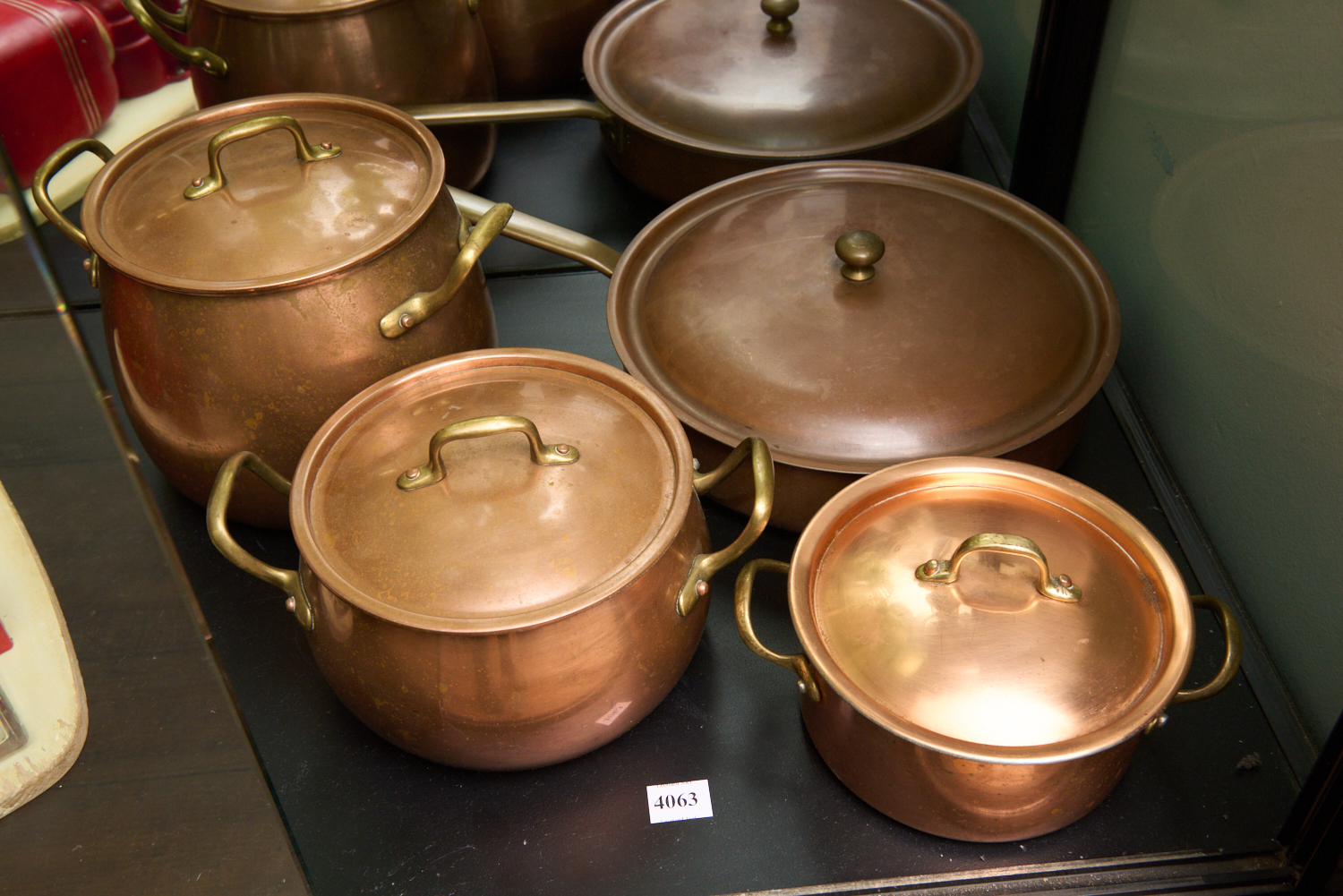 COLLECTION OF FOUR COPPER POTS WITH BRASS HANDLES, LEONARD JOEL LOCAL DELIVERY SIZE: SMALL